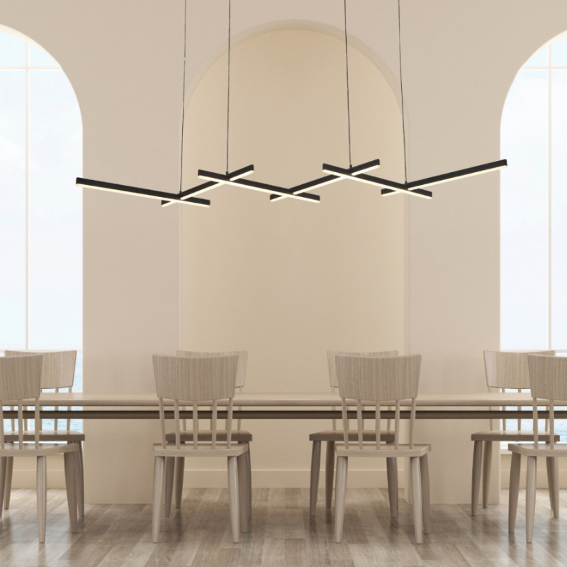 La lampada a sospensione a LED 1948 presenta un design accattivante e contemporaneo, con base in metallo e alluminio nero abbinati a parti in acrilico.