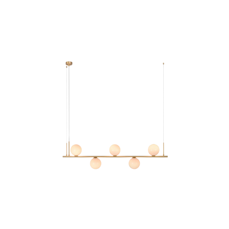 La lampada a sospensione 1998 combina un design moderno con una base in metallo dorato opaco e un delicato vetro opalino rosa pastello.
