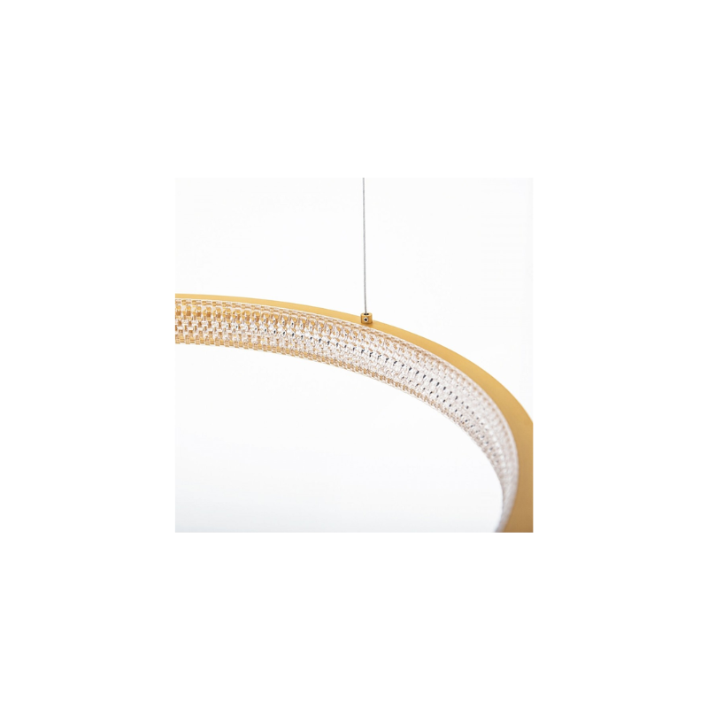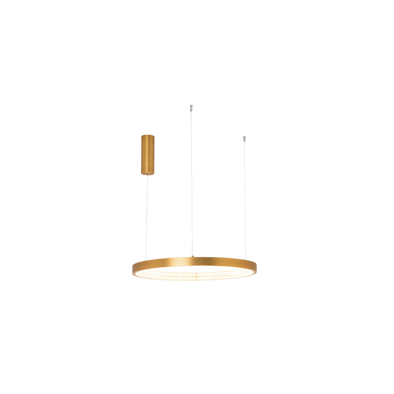 La lampada a sospensione a LED 2006 è realizzata in alluminio spazzolato oro e acrilico, con un design ad anello che unisce estetica moderna e funzionalità.