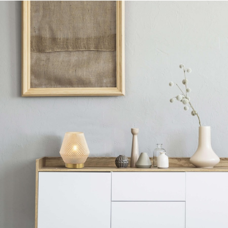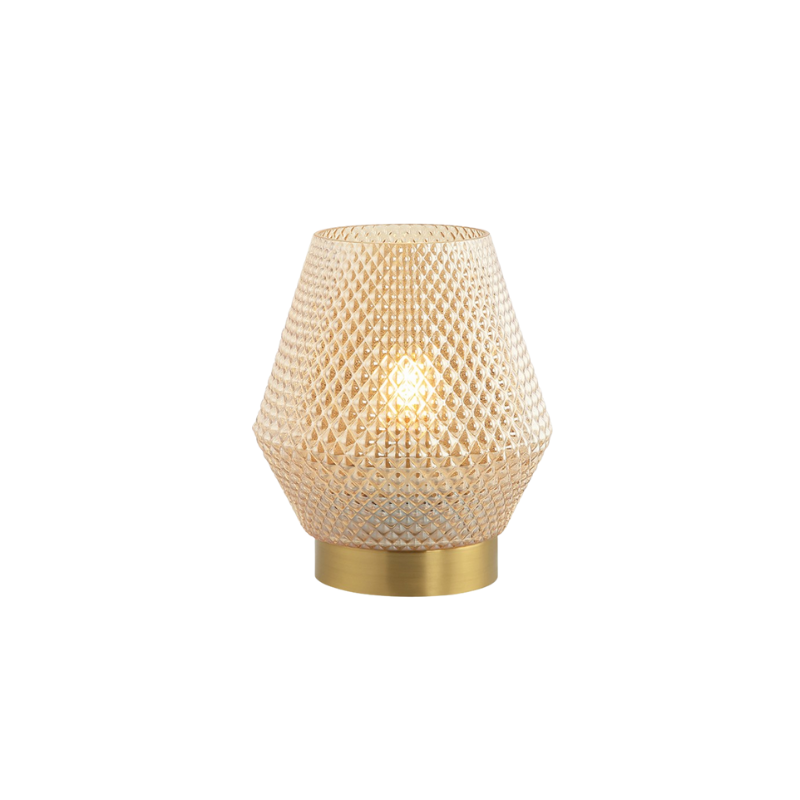 La lampada da tavolo 20251 presenta elementi decorativi in vetro trasparente e metallo color ottone, creando un design sofisticato ed elegante. Utilizza una lampadina E27 con una potenza massima di 25W ed è dotata di interruttore on/off. La lampada ha un cavo da 150 cm, che unisce stile e praticità.