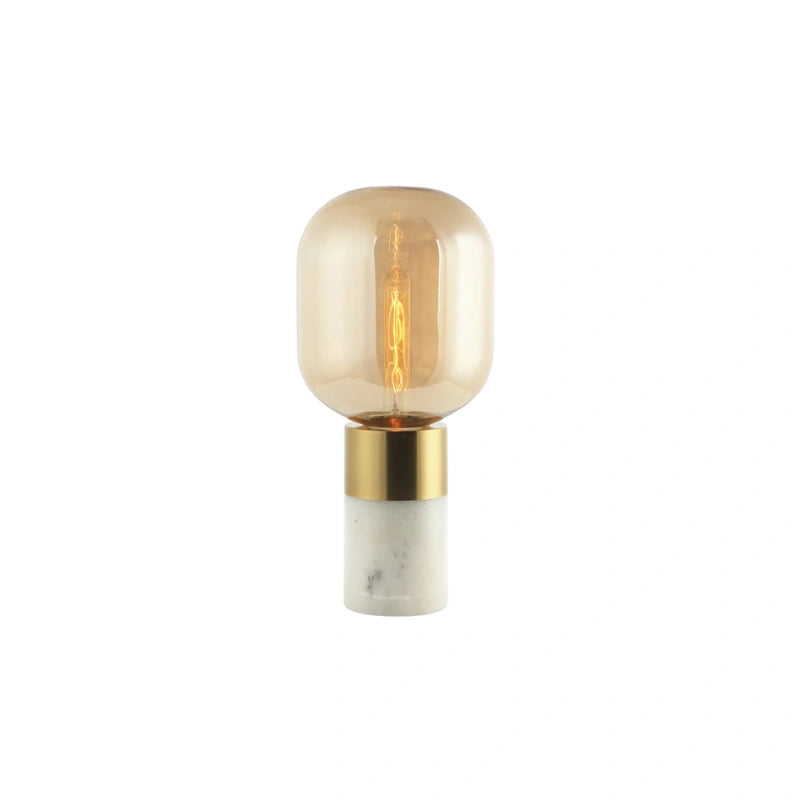 La lampada da tavolo 20253 combina il vetro champagne con elementi metallici color ottone anticato e una base in marmo bianco, conferendole un aspetto elegante. Utilizza una lampadina E27 con una potenza massima di 25W ed è dotata di interruttore on/off. È dotata di un cavo da 150 cm, che offre stile e funzionalità.
