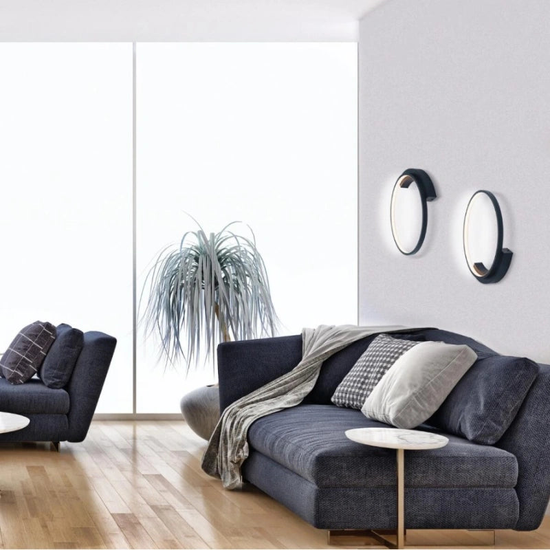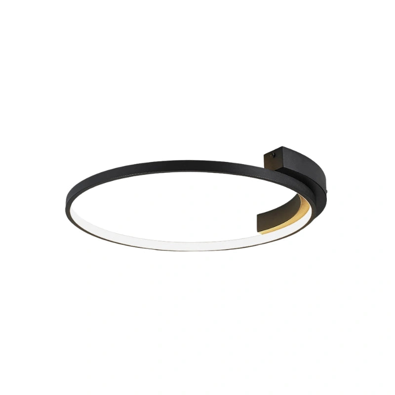 La plafoniera 2076 è una lampada LED decorativa a forma di anello, realizzata in alluminio con rivestimento nero testurizzato, base in metallo dello stesso colore e parti in silicone.