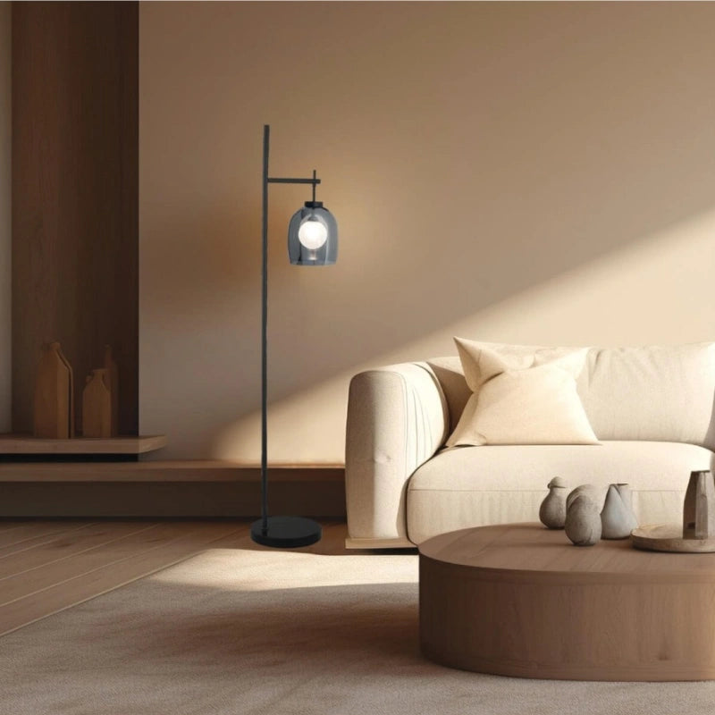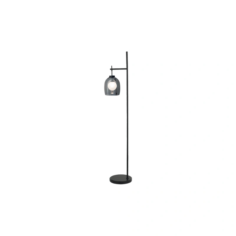 Elegante lampada da terra con vetro fumé all'esterno e vetro opalino all'interno, base in marmo nero e struttura in metallo nero. Questa speciale combinazione offre un'illuminazione calda e suggestiva, ideale per qualsiasi spazio. Compatibile con lampadina LED G9, potenza massima 5W, include cavo da 150 cm per un posizionamento flessibile.