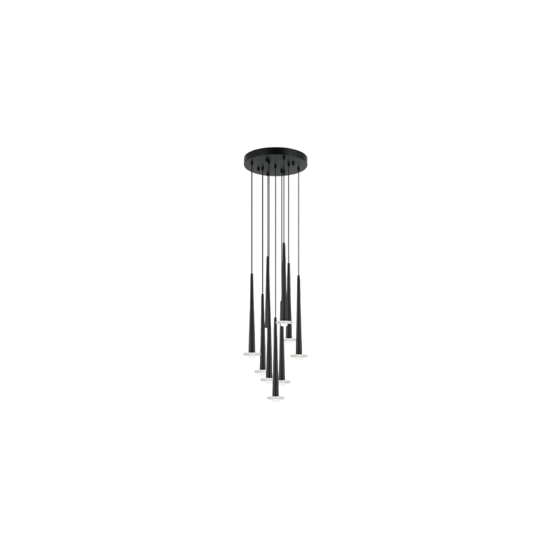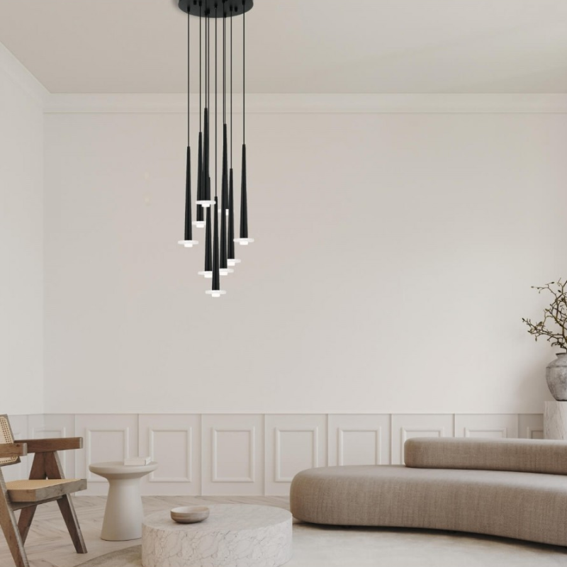La lampada a sospensione a LED 22113 è un'eccellente scelta per l'illuminazione d'interni, con nove sorgenti luminose in alluminio conico, disposte asimmetricamente sulla base metallica.