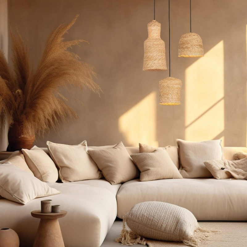 La plafoniera 22167 unisce l'eleganza rustica al design moderno, con base in metallo nero e stuoia in paglia intrecciata naturale.