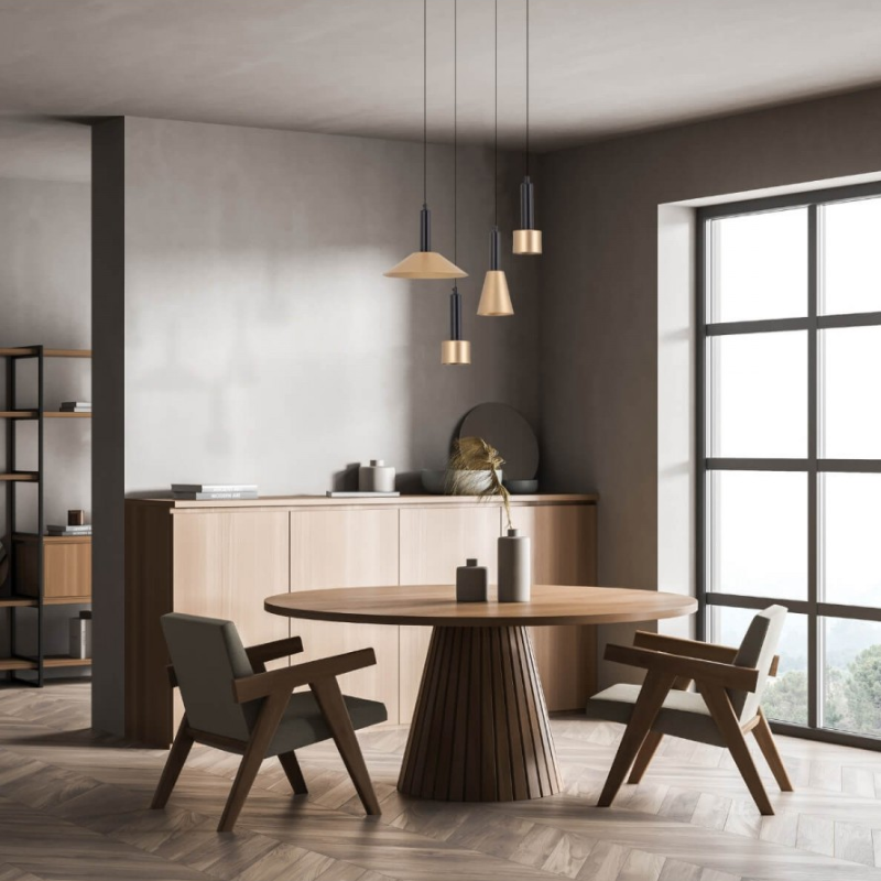 Il corpo illuminante presenta una linea slanciata e geometrica, composta da un elemento cilindrico a due stadi: una parte superiore più sottile che si innesta in una base leggermente più larga, dove è alloggiata la sorgente luminosa.