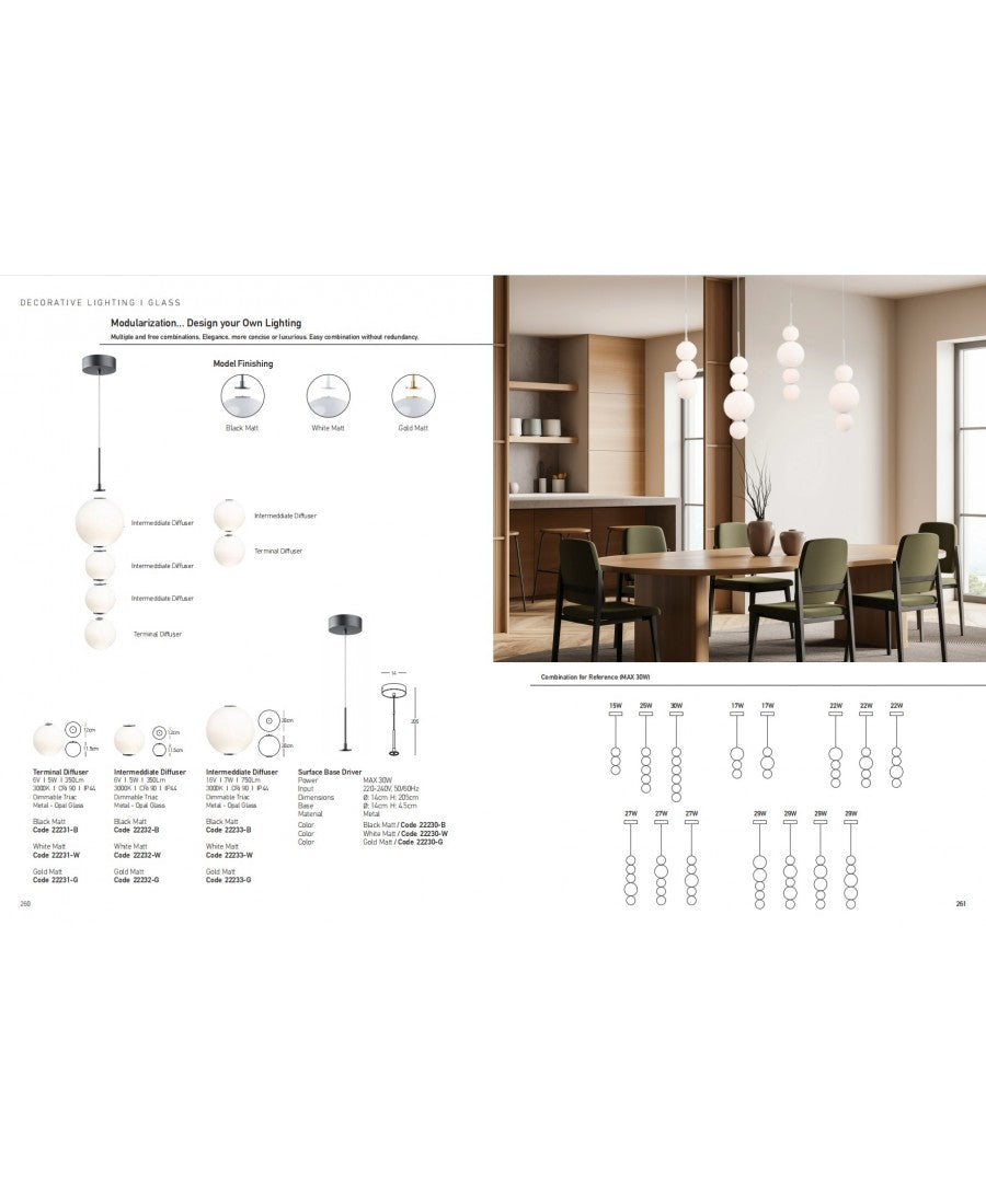Il modello 22233-B1 è un apparecchio di illuminazione con vetro sferico opalino intermedio, progettato come parte di un sistema di illuminazione flessibile, decorativo e architettonico.