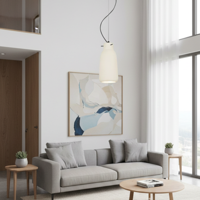 La lampada si distingue per il suo diffusore a forma di campana allungata, caratterizzato da linee fluide e organiche che si restringono delicatamente verso l'alto.
