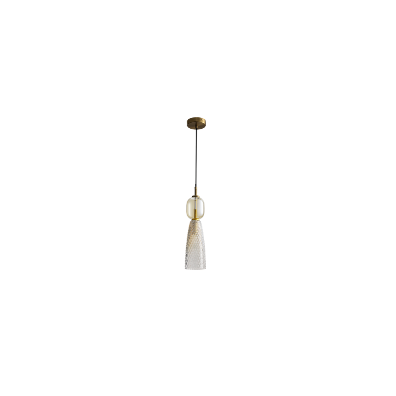 La lampada a sospensione 23008 coniuga stile vintage e design contemporaneo. Presenta una base in metallo con finitura ottone anticato e due tipi di vetro, trasparente e goffrato, che creano contrasto e un effetto visivo accattivante.