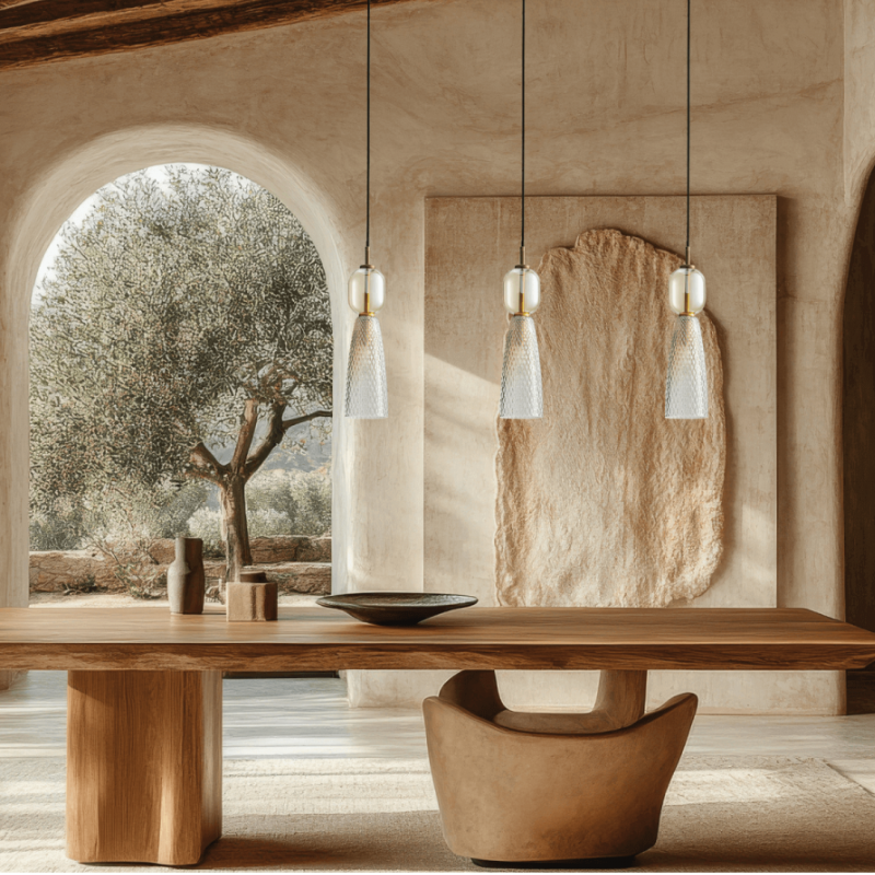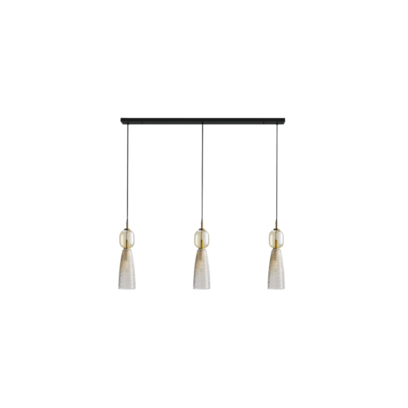 La lampada a sospensione 23009 è un'elegante lampada da interni con 3 attacchi E14 (lampadine non incluse) in fila, con una potenza massima di 40W per lampadina. Realizzata in metallo con finitura ottone anticato e base nera opaca, si abbina armoniosamente a due elementi in vetro di forme diverse.