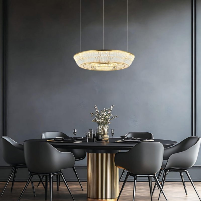 La lampada a sospensione a LED 23048 combina metallo e cristallo in una sofisticata finitura in ottone anticato.