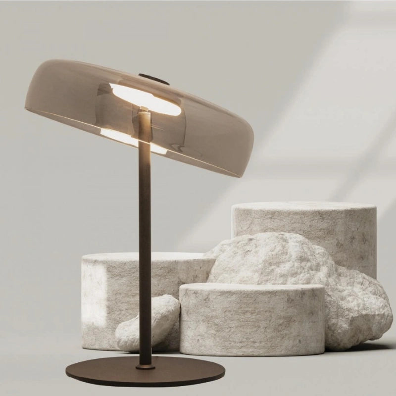La lampada da tavolo Zambelis 23054 combina un design moderno con metallo nero opaco e vetro fumé.
