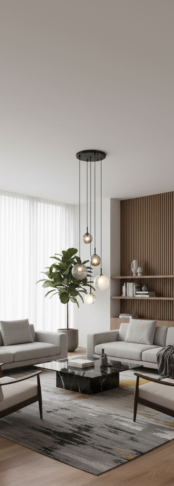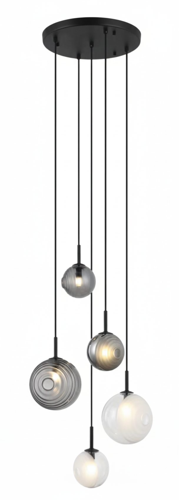 Questa lampada a sospensione si distingue per la sua composizione a cascata, formata da cinque diffusori sferici in vetro posizionati ad altezze sfalsate. Il design è caratterizzato da un elegante contrasto tra il rigore della struttura metallica e la morbidezza delle sfere luminose.