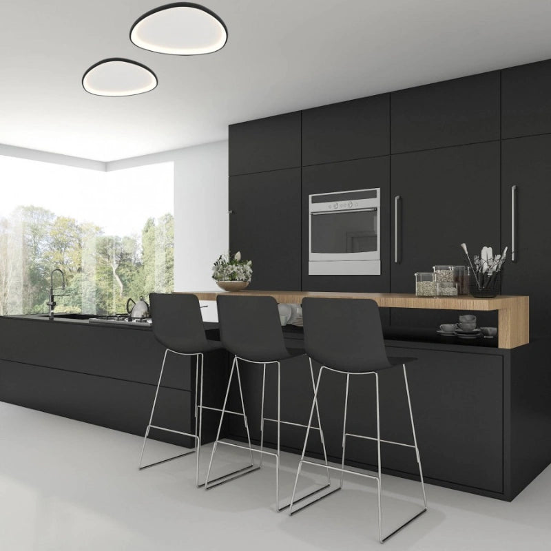 Questa plafoniera LED è un pezzo di design unico che combina forme geometriche morbide e materiali a contrasto per creare un punto luce scultoreo e moderno.