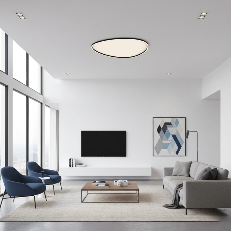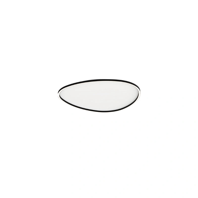 Illumina i tuoi spazi con questa raffinata plafoniera a LED, caratterizzata da una forma ovale asimmetrica e un bordo in metallo color nero che aggiunge un tocco di lusso discreto.