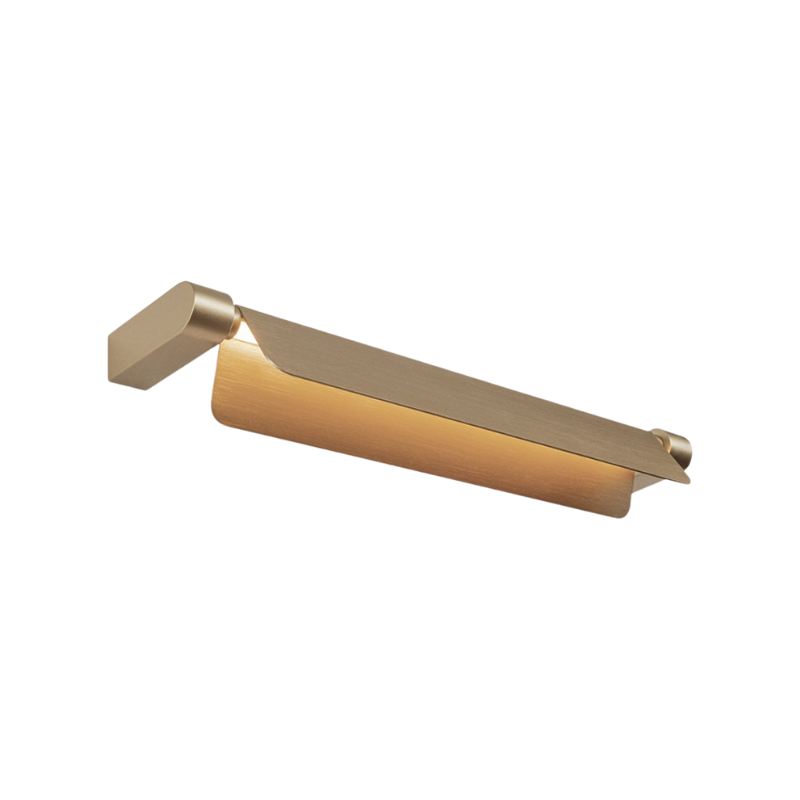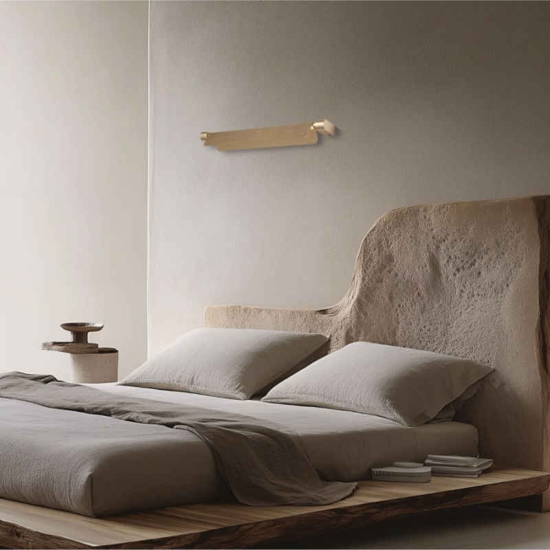 Applique da parete dal design essenziale ed elegante, caratterizzata dalla combinazione di un corpo in legno chiaro naturale e dettagli in ottone lucido.