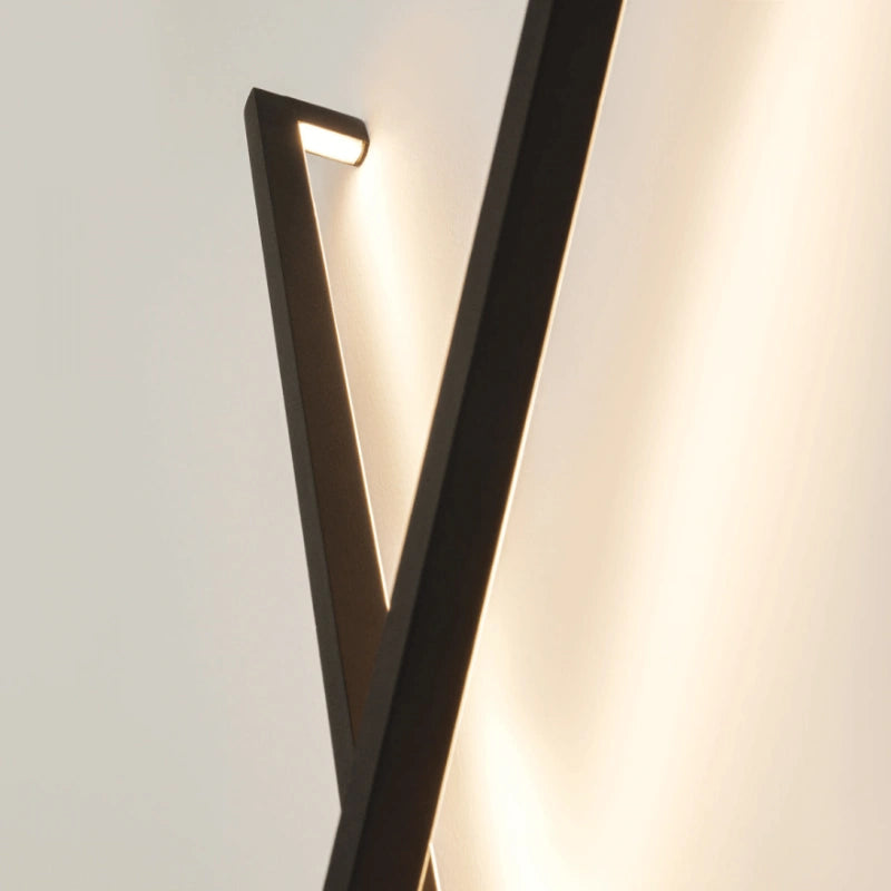 Questa applique da parete si distingue per il suo design grafico e contemporaneo. L'illuminazione è indiretta, prodotta da una striscia a LED integrata che emette una luce calda e soffusa. Questo crea un suggestivo alone luminoso sulla parete, che mette in risalto la forma della lampada stessa e genera un'atmosfera accogliente. Si tratta di un pezzo che funge sia da fonte di luce che da elemento decorativo di forte impatto visivo, perfetto per ambienti moderni.