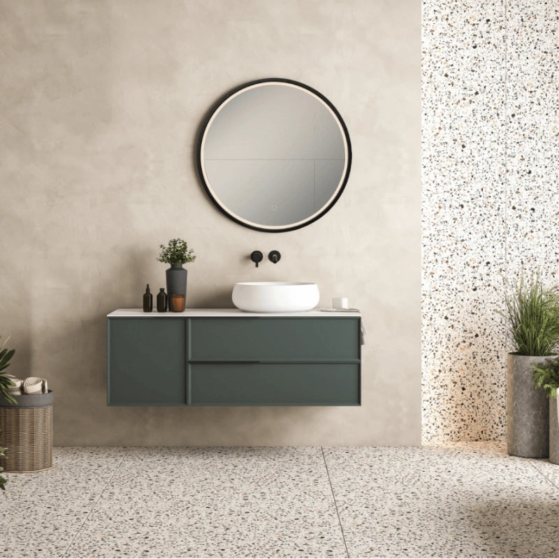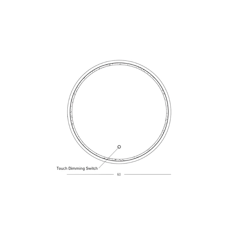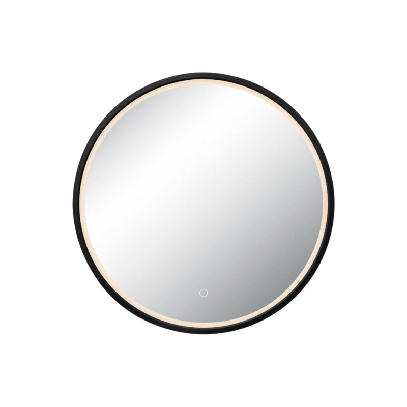 Specchio rotondo ed elegante, incorniciato da una sottile cornice color oro o ottone. La cornice include una discreta retroilluminazione perimetrale, che aggiunge un tocco caldo e sofisticato all'ambiente.