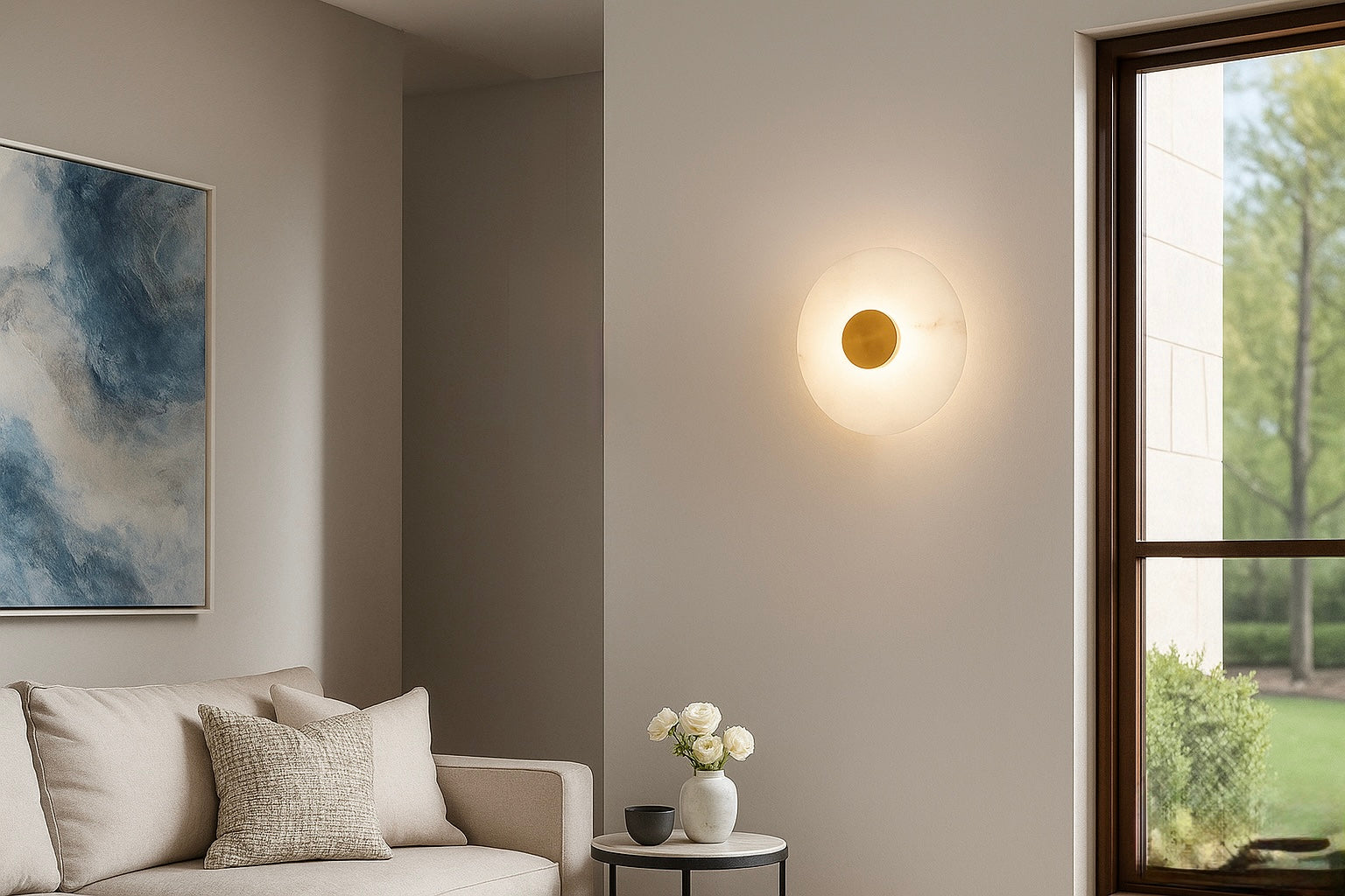 Plafoniera/Applique di design minimale. Disco in marmo traslucido che diffonde una luce morbida e calda, impreziosito da un dettaglio centrale in ottone spazzolato. Un tocco di eleganza scultorea per qualsiasi parete o soffitto.