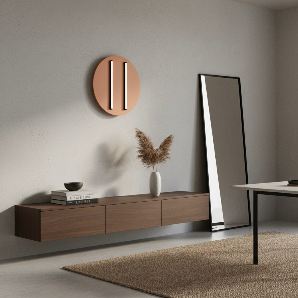 Un'applique scultorea che gioca con forme e colori. Il grande disco in una calda tonalità funge da sfondo per due barre luminose LED parallele, che creano un forte effetto grafico e moderno. Ideale per aggiungere un tocco di colore e un'illuminazione d'accento unica a qualsiasi parete.