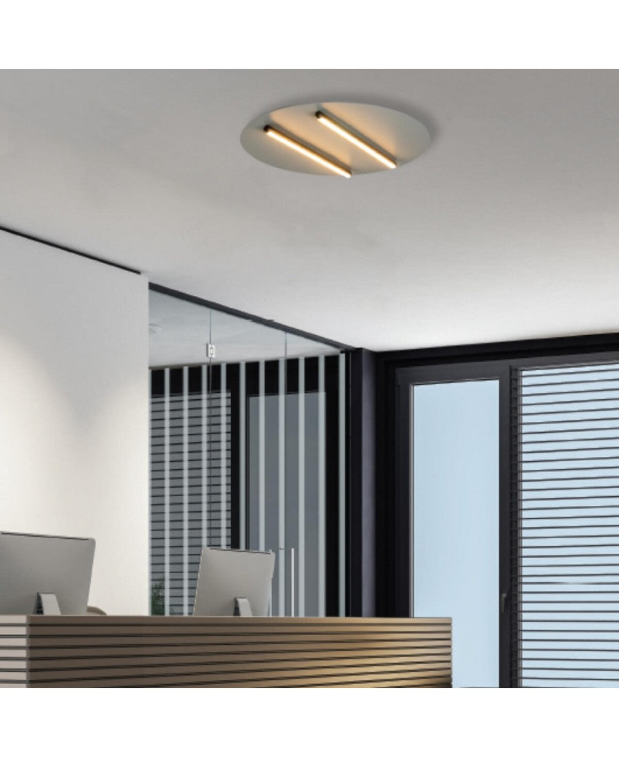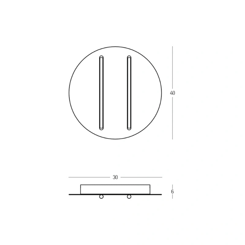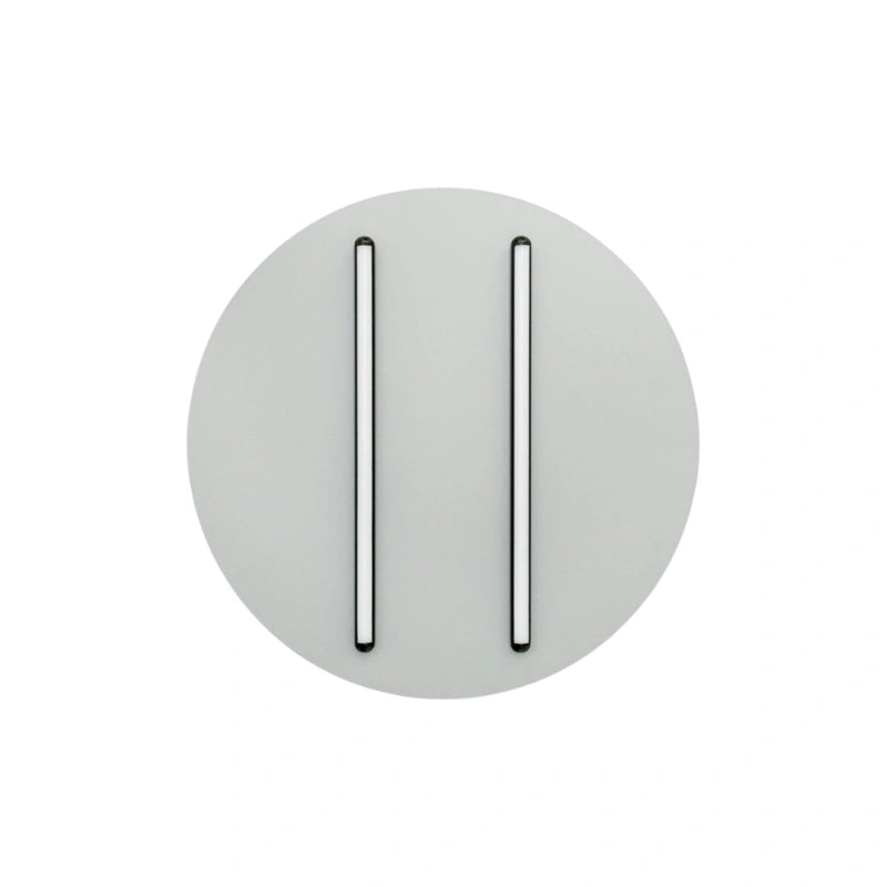 Un'applique scultorea che gioca con forme e colori. Il grande disco in una calda tonalità funge da sfondo per due barre luminose LED parallele, che creano un forte effetto grafico e moderno. Ideale per aggiungere un tocco di colore e un'illuminazione d'accento unica a qualsiasi parete.