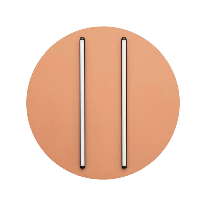 Un'applique scultorea che gioca con forme e colori. Il grande disco in una calda tonalità funge da sfondo per due barre luminose LED parallele, che creano un forte effetto grafico e moderno. Ideale per aggiungere un tocco di colore e un'illuminazione d'accento unica a qualsiasi parete.