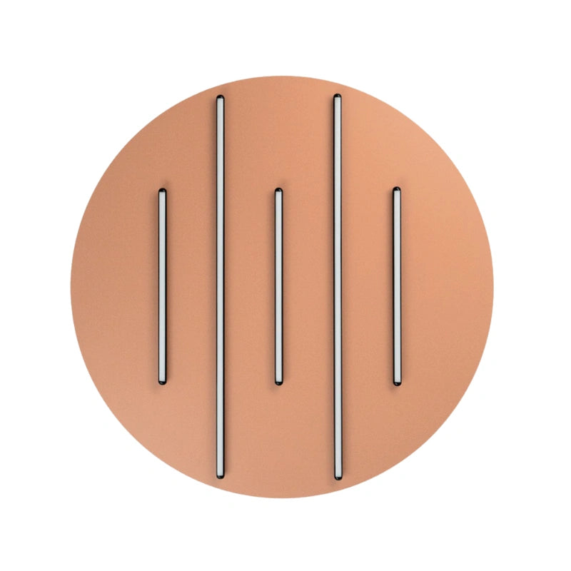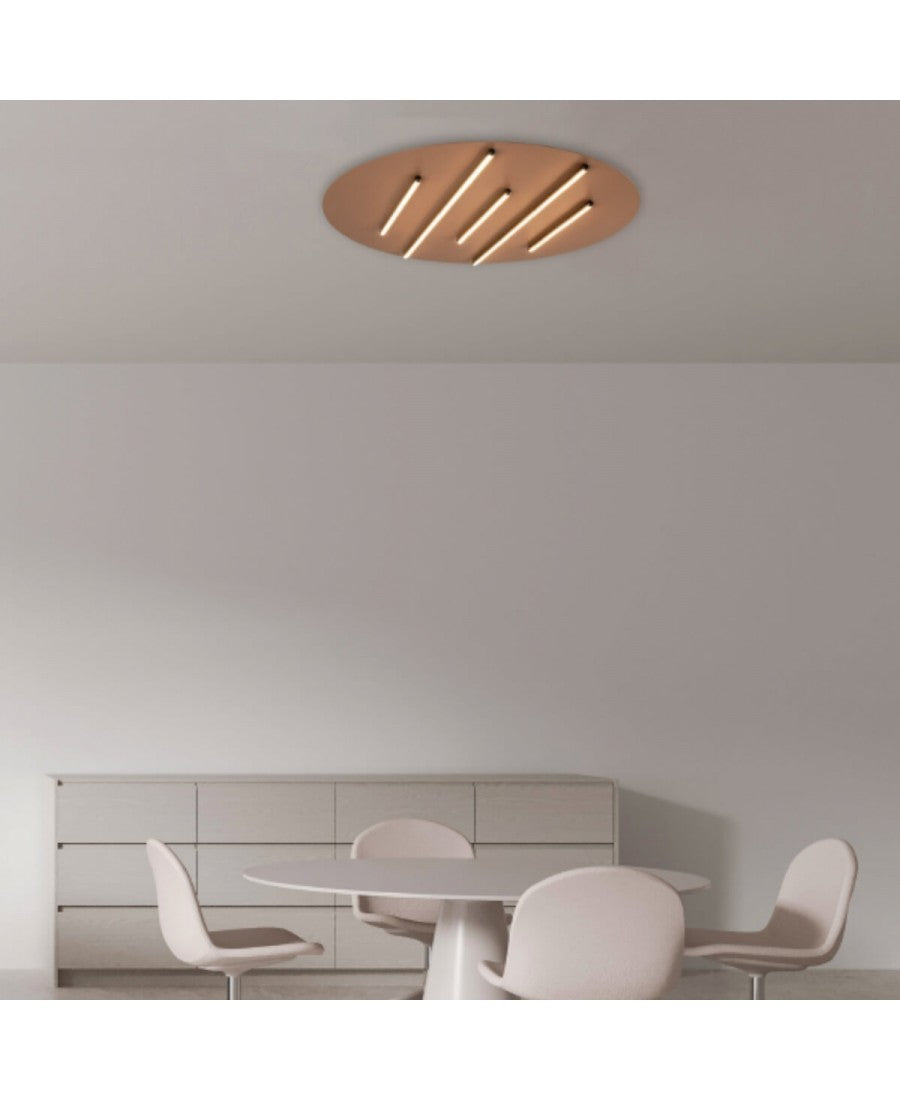 Un'applique scultorea che gioca con forme e colori. Il grande disco in una calda tonalità funge da sfondo per due barre luminose LED parallele, che creano un forte effetto grafico e moderno. Ideale per aggiungere un tocco di colore e un'illuminazione d'accento unica a qualsiasi parete.