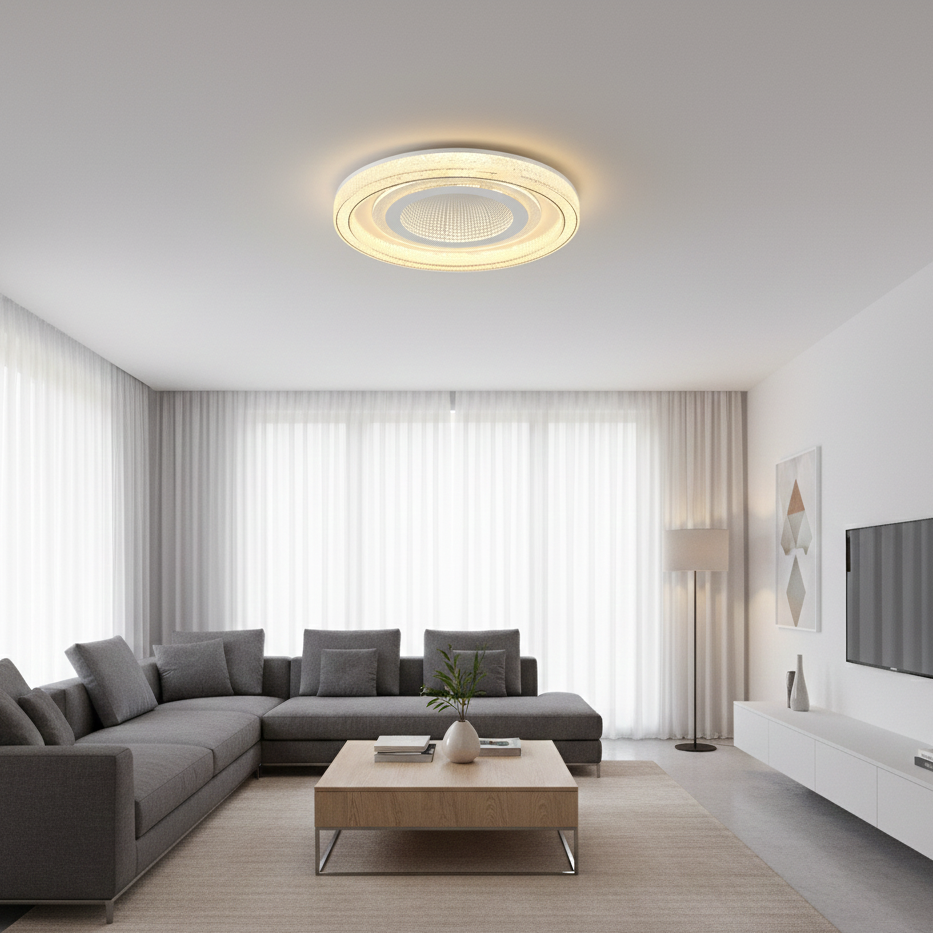 La plafoniera Alsuna non è solo un corpo illuminante, ma un vero e proprio elemento d’arredo capace di trasformare l’atmosfera di ogni stanza. Caratterizzata da un design circolare multistrato, Alsuna combina un’estetica contemporanea con dettagli scintillanti che richiamano l'eleganza del cristallo.