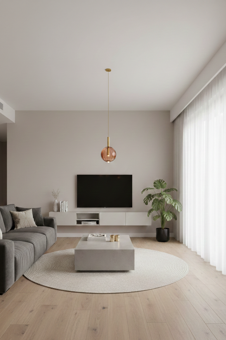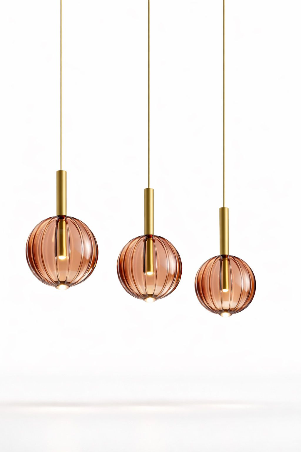 La sospensione Ambra Fluida celebra la bellezza del vetro soffiato artigianale. Caratterizzata da un diffusore sferico in vetro borosilicato color ambra, presenta una delicata lavorazione a coste verticali (plissé) che crea un affascinante gioco di rifrazioni luminose. Il cuore della lampada è un cilindro in ottone spazzolato che scende elegantemente all'interno della sfera, nascondendo la sorgente luminosa e proiettando una luce morbida, calda e accogliente.