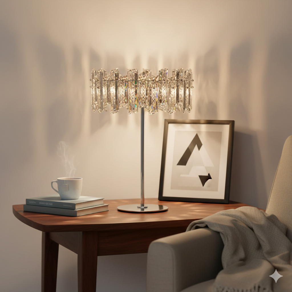 Arcadia è una lampada da tavolo dal design classico ed elegante, caratterizzata da una base in metallo dorato o cromato e da magnifici cristalli K9 che diffondono la luce in modo morbido e scintillante. La lampada è perfetta per illuminare con un tocco di raffinatezza scrivanie, console o tavolini da salotto, creando un'atmosfera suggestiva e sofisticata.