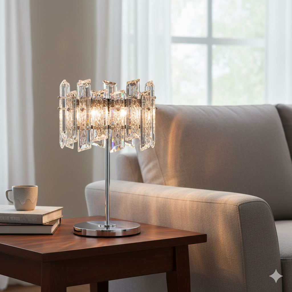 Arcadia è una lampada da comodino dal design classico ed elegante, caratterizzata da una struttura in metallo dorato o cromato e da magnifici cristalli K9 che diffondono la luce in modo morbido e scintillante. La lampada è perfetta per illuminare con un tocco di raffinatezza comodini, console o tavolini da salotto, creando un'atmosfera suggestiva e sofisticata.