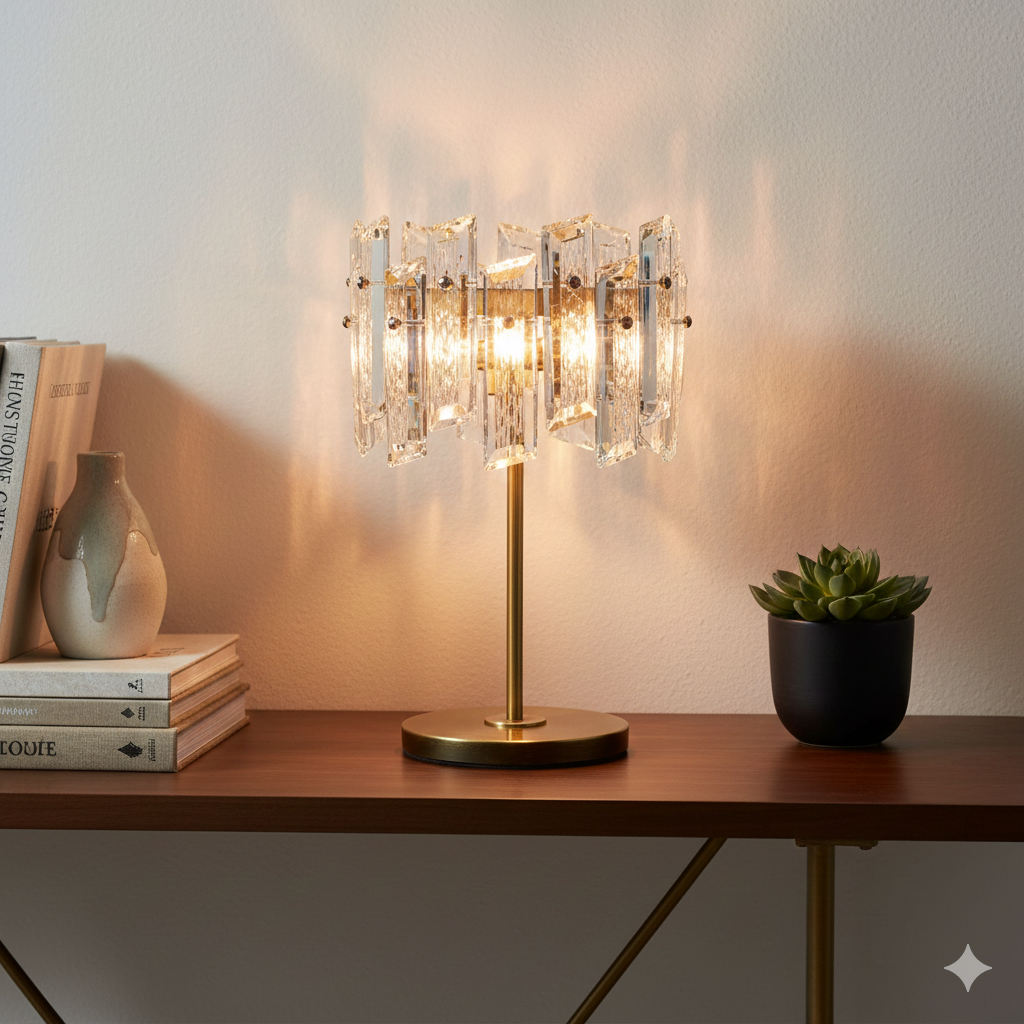 Arcadia è una lampada da comodino dal design classico ed elegante, caratterizzata da una struttura in metallo dorato o cromato e da magnifici cristalli K9 che diffondono la luce in modo morbido e scintillante. La lampada è perfetta per illuminare con un tocco di raffinatezza comodini, console o tavolini da salotto, creando un'atmosfera suggestiva e sofisticata.