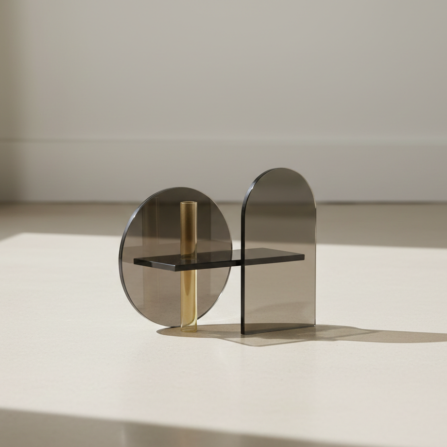 Serie di sculture geometriche o con vaso monofiore in vetro e specchio colorati.