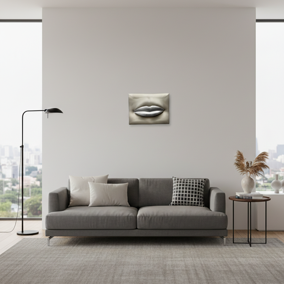 L'opera "Baciami" cattura l'essenza stessa della seduzione attraverso un’estetica pulita e contemporanea. Al centro di un pannello rettangolare dalle tonalità neutre e vellutate, emerge un altorilievo che riproduce la forma carnosa e definita di due labbra.