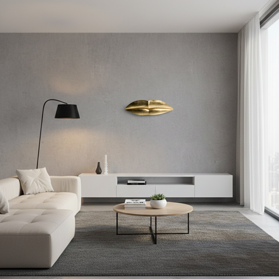 L'opera "Baciami" cattura l'essenza stessa della seduzione attraverso un’estetica pulita e contemporanea. Al centro di un pannello rettangolare dalle tonalità neutre e vellutate, emerge un altorilievo che riproduce la forma carnosa e definita di due labbra.
