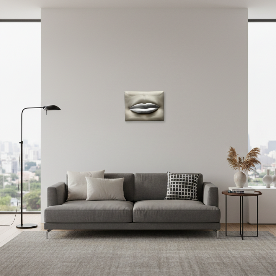 L'opera "Baciami" cattura l'essenza stessa della seduzione attraverso un’estetica pulita e contemporanea. Al centro di un pannello rettangolare dalle tonalità neutre e vellutate, emerge un altorilievo che riproduce la forma carnosa e definita di due labbra.