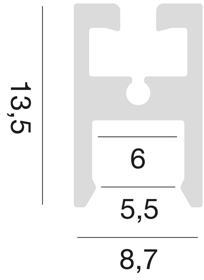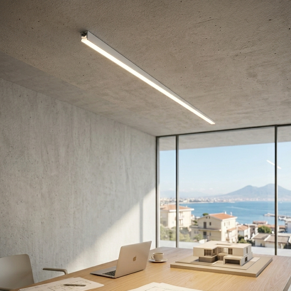 Sistema modulare in alluminio estruso sezionabile per installazione a plafone su parete o soffitto o installazione a sospensione. Dotato di 4 staffette per il fissaggio.