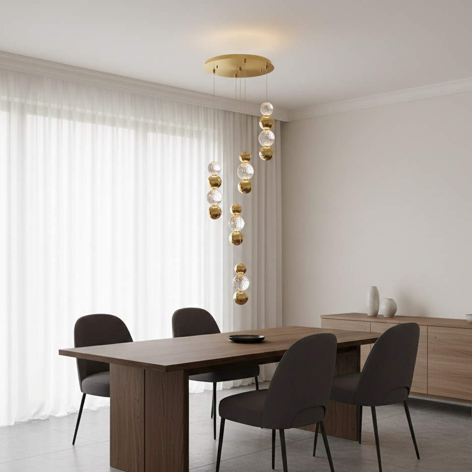 Brillante è una sospensione moderna a 5 pendenti che si distingue per il suo design elegante e giocoso. Le sfere, realizzate in acrilico trasparente e metallo cromato, diffondono una luce calda e omogenea, perfetta per creare un'atmosfera accogliente e rilassante in qualsiasi ambiente. La sospensione è dotata di LED integrati dimmerabili, che permettono di regolare l'intensità della luce in base alle proprie esigenze.