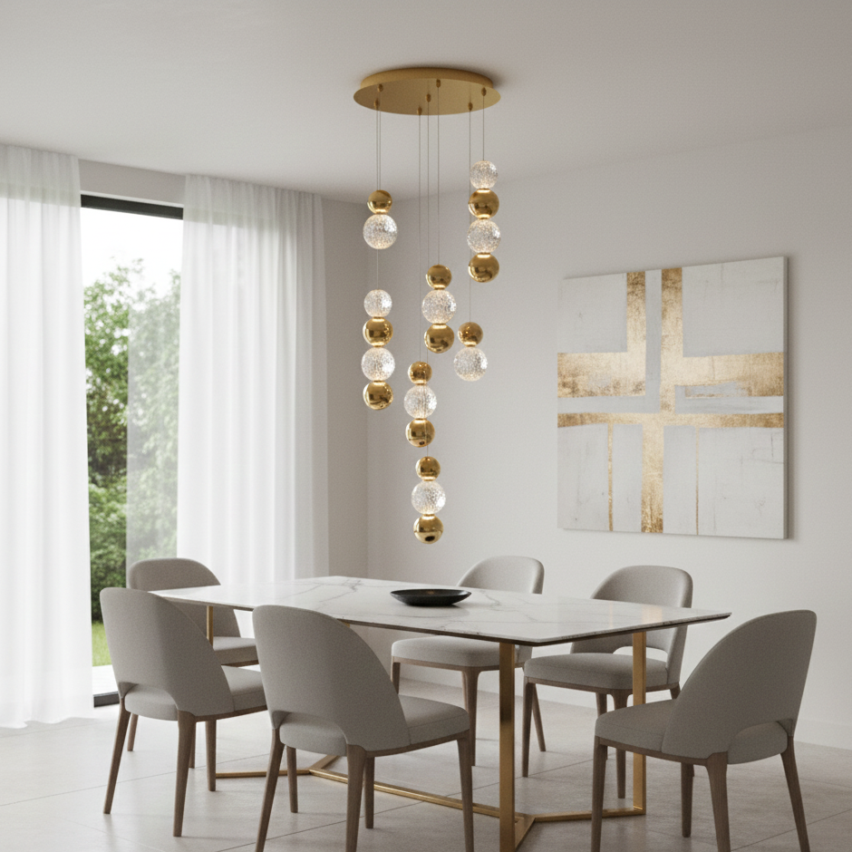 Brillante è una sospensione moderna a 7 pendenti che si distingue per il suo design elegante e personalizzabile. Le sfere, realizzate in acrilico trasparente e metallo cromato, diffondono una luce calda e omogenea, perfetta per creare un'atmosfera accogliente e rilassante in qualsiasi ambiente. La lunghezza dei fili è regolabile a piacimento, permettendo di creare diverse composizioni luminose e di adattare la sospensione a qualsiasi altezza del soffitto. I LED integrati sono dimmerabili, così da poter regolare l'intensità della luce in base alle proprie esigenze.
