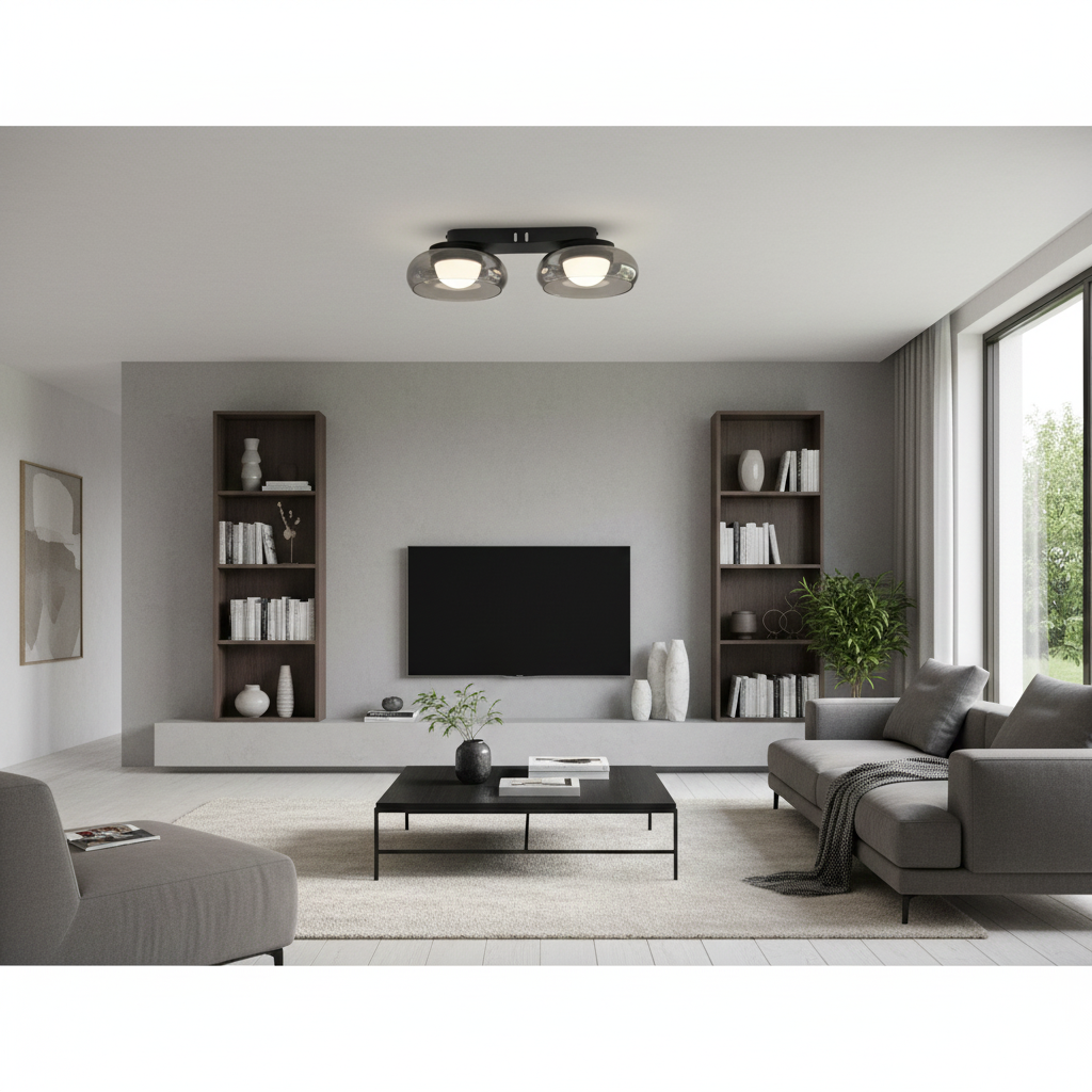 - Plafoniera metallo nero satinato, vetro color fumè, acrilico opale, molteplici passaggi tramite interruttore a muro, colore selezionabile, funzione di memoria