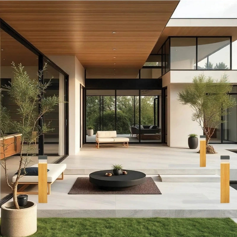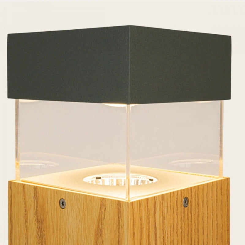Questo paletto luminoso si distingue per il suo design a colonna geometrica e l'uso di una finitura calda e naturale, ideale per illuminare vialetti o giardini in un contesto moderno-organico.