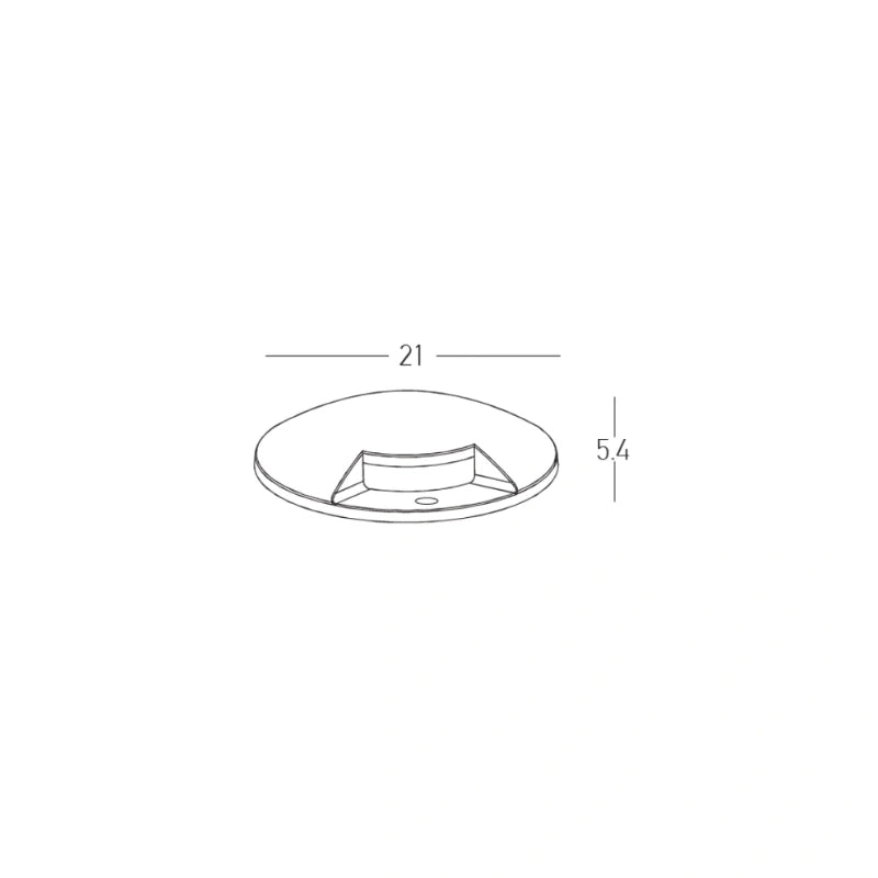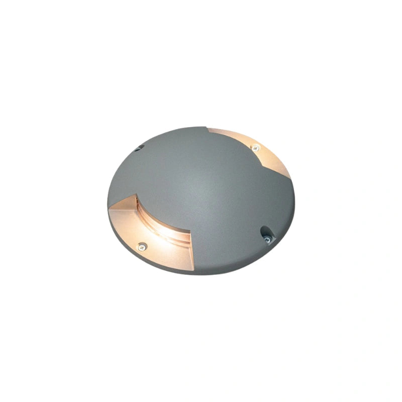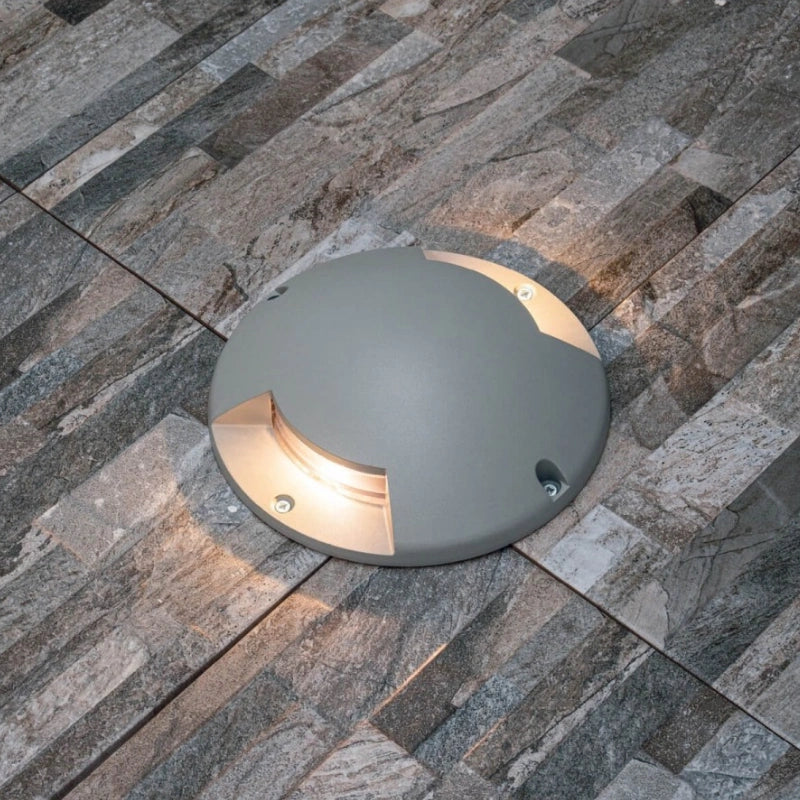 Un faretto da incasso a pavimento di forma circolare, con una finitura opaca di colore grigio chiaro o antracite. È incassato in una pavimentazione esterna composta da piastrelle rettangolari di colore grigio e marrone-grigio, disposte a spina di pesce o con un motivo a mosaico rettilineo.