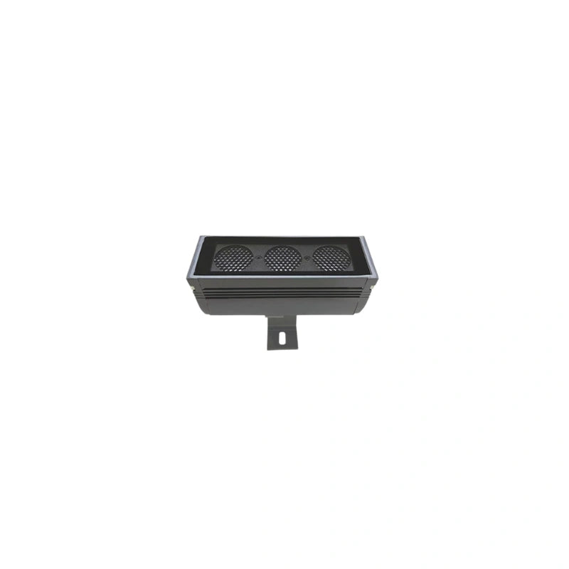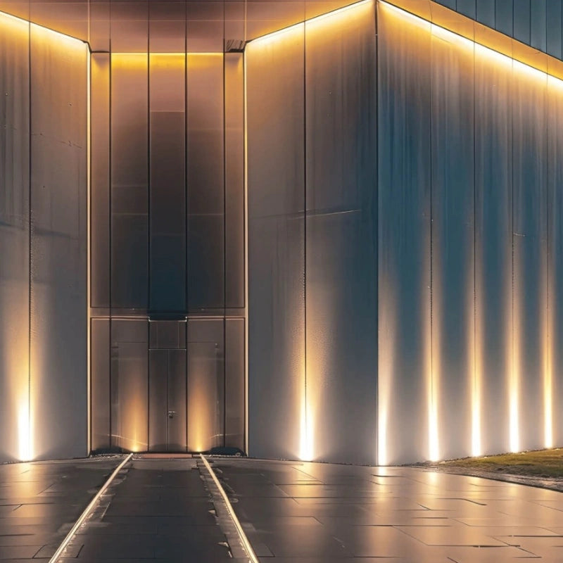 L'illuminazione di questa facciata moderna è ottenuta tramite una combinazione di apparecchi a LED che creano un effetto scenografico di grande impatto, enfatizzando la verticalità e l'orizzontalità della struttura.