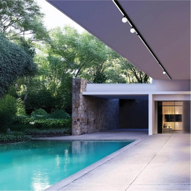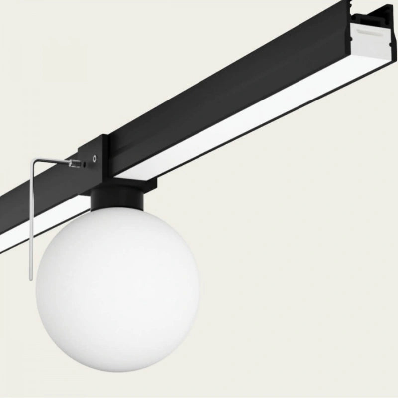 Il LED Globo Opale 9W è un apparecchio di illuminazione moderna, progettato per essere l'elemento visibile di un sistema di illuminazione esterna a binario o a profilo lineare, come quello installato sotto il portico.