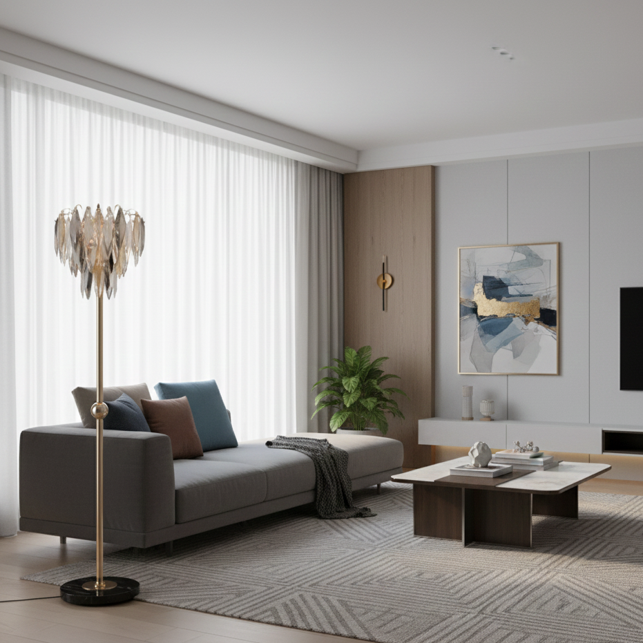 La lampada da terra Elinor rappresenta il perfetto equilibrio tra opulenza classica e design geometrico contemporaneo.