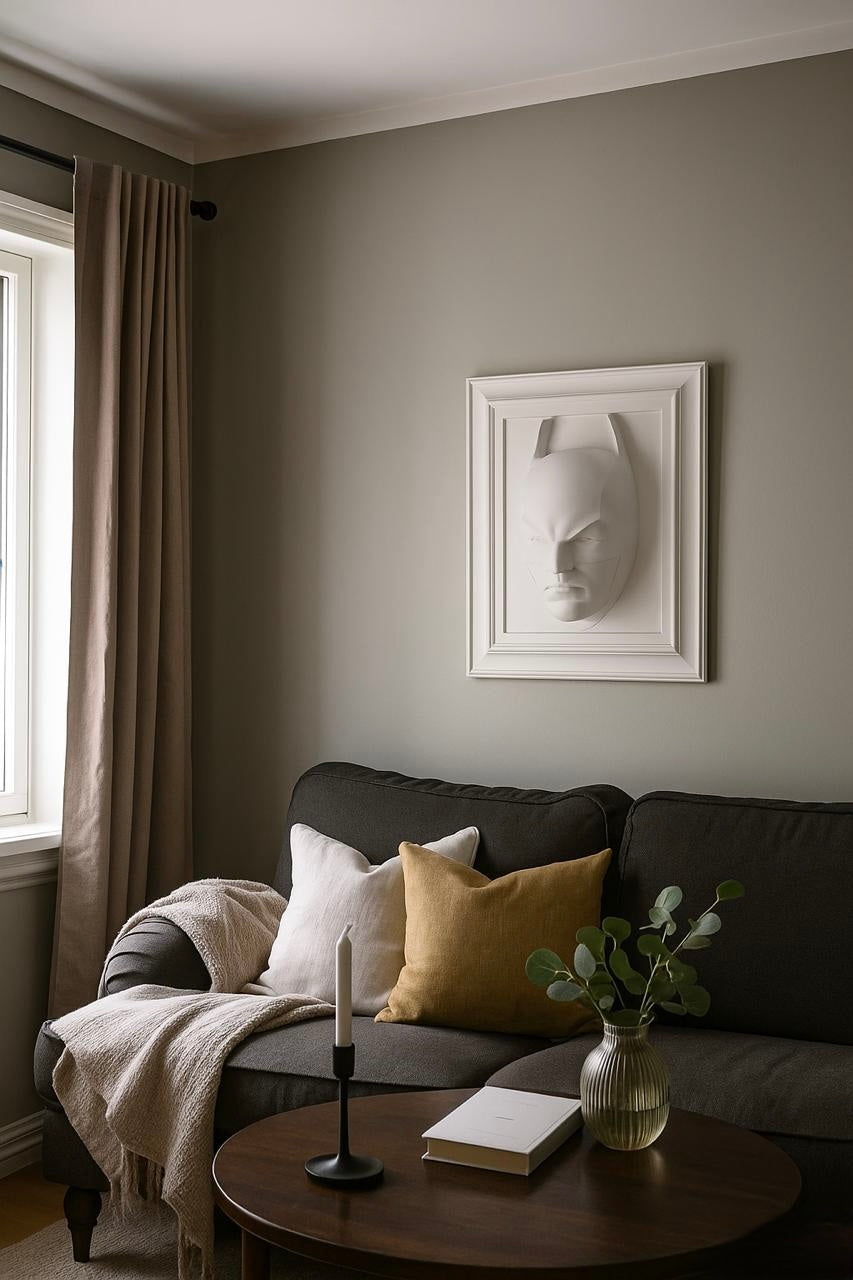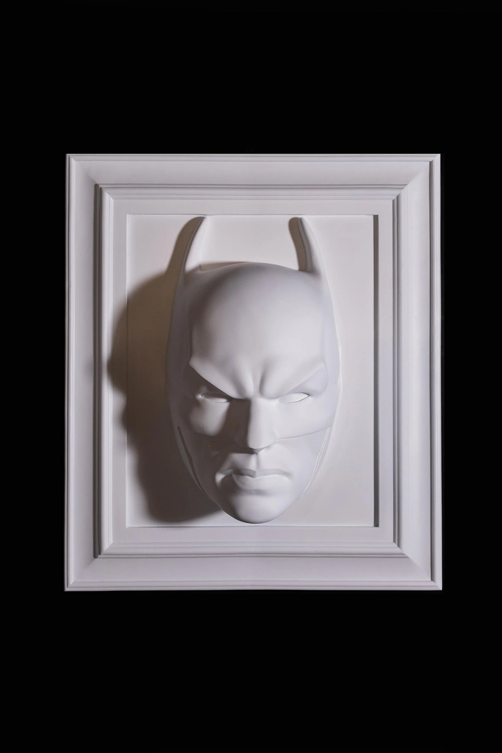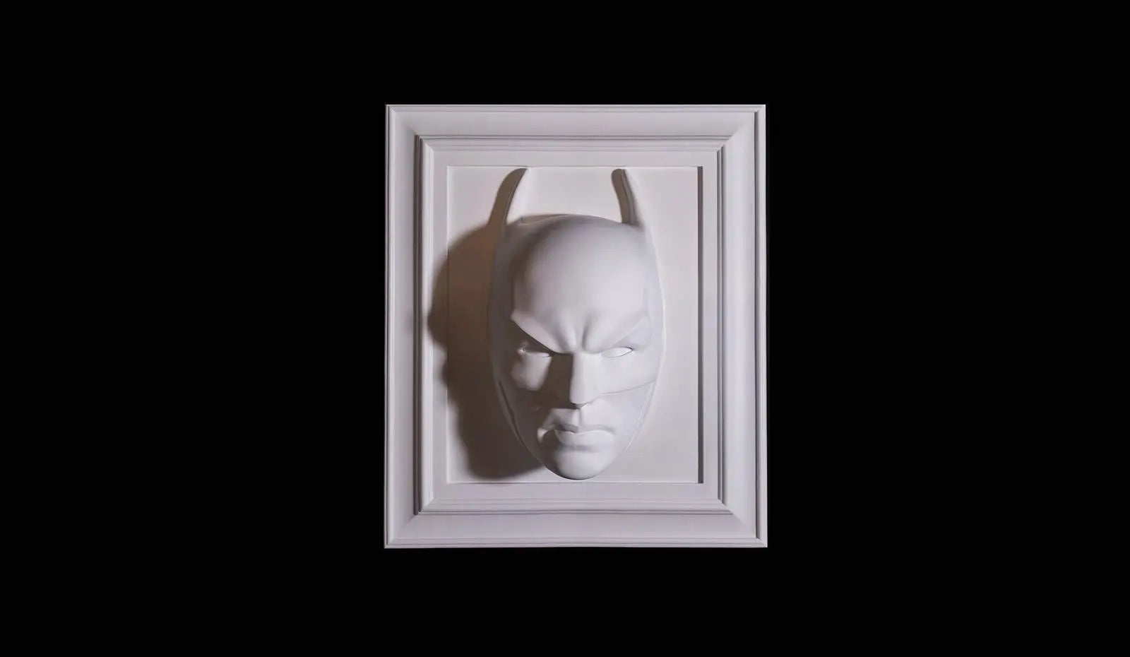 Un'opera scultorea elegante e di forte impatto, realizzata interamente in resina. La scultura riproduce l'iconica maschera di Batman in una finitura bianco candido e opaco, elevando il popolare simbolo della cultura pop a oggetto d'arte minimalista e contemporaneo.