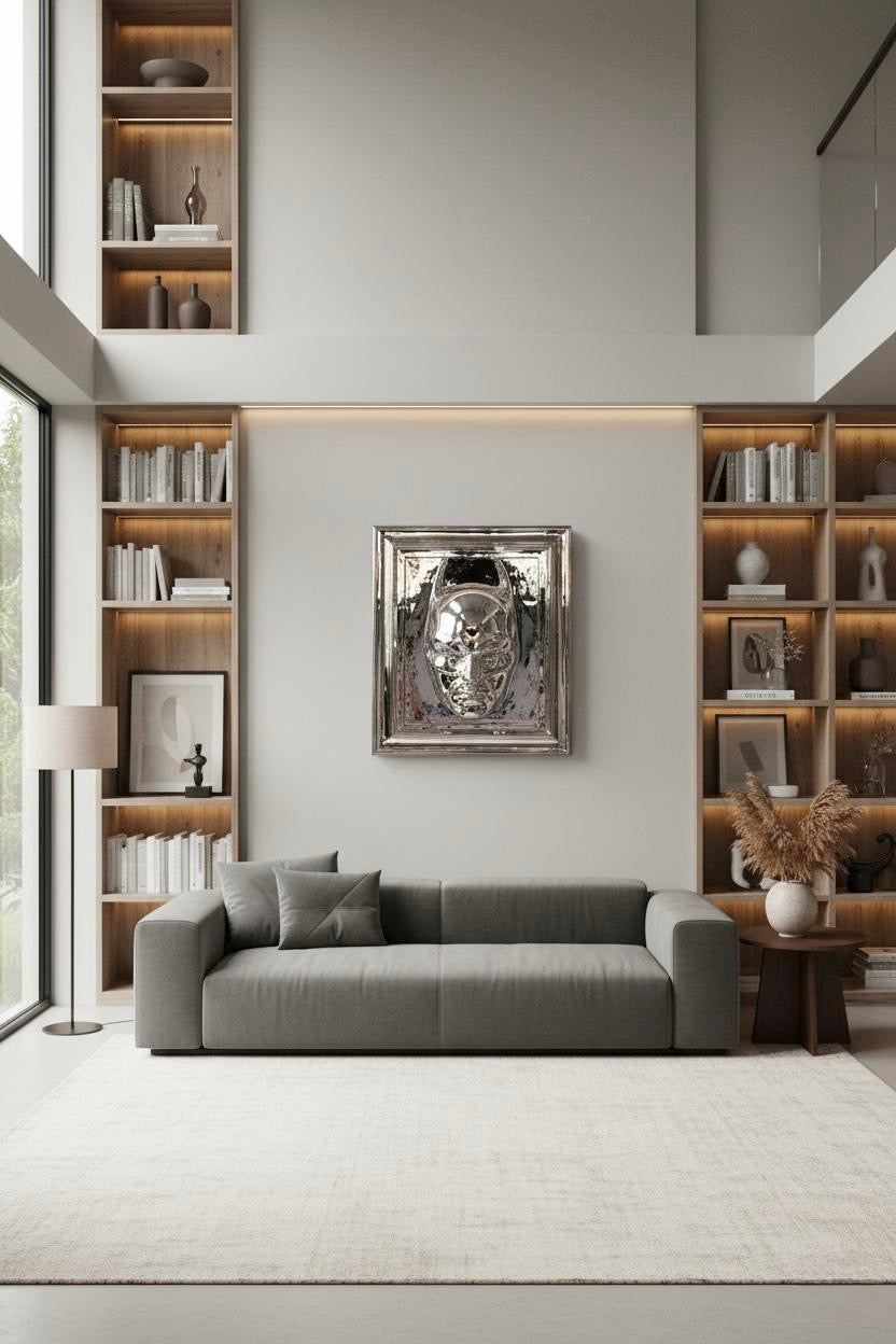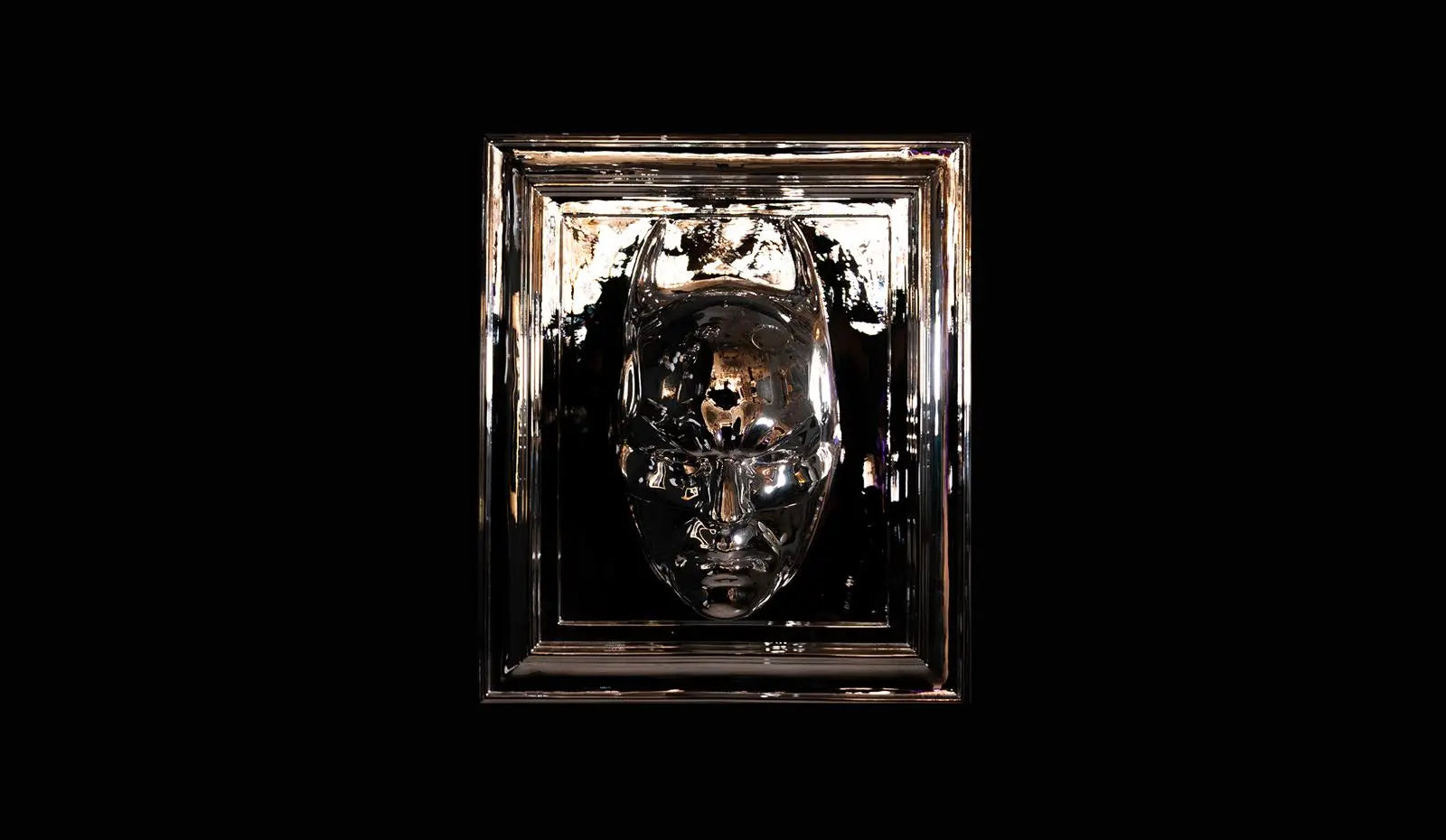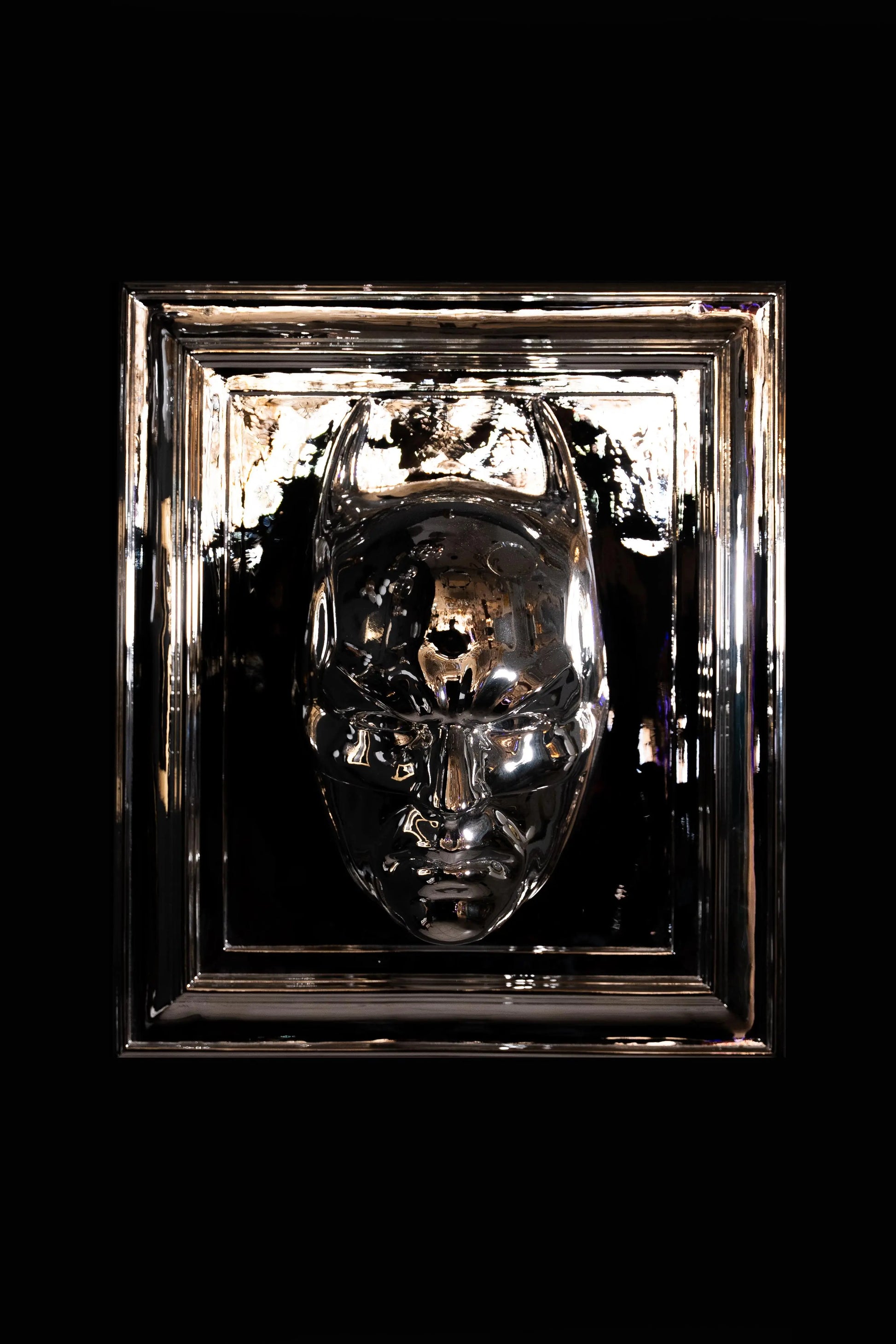 Un'opera scultorea elegante e di forte impatto, realizzata interamente in resina. La scultura riproduce l'iconica maschera di Batman in una finitura cromo, elevando il popolare simbolo della cultura pop a oggetto d'arte minimalista e contemporaneo.
