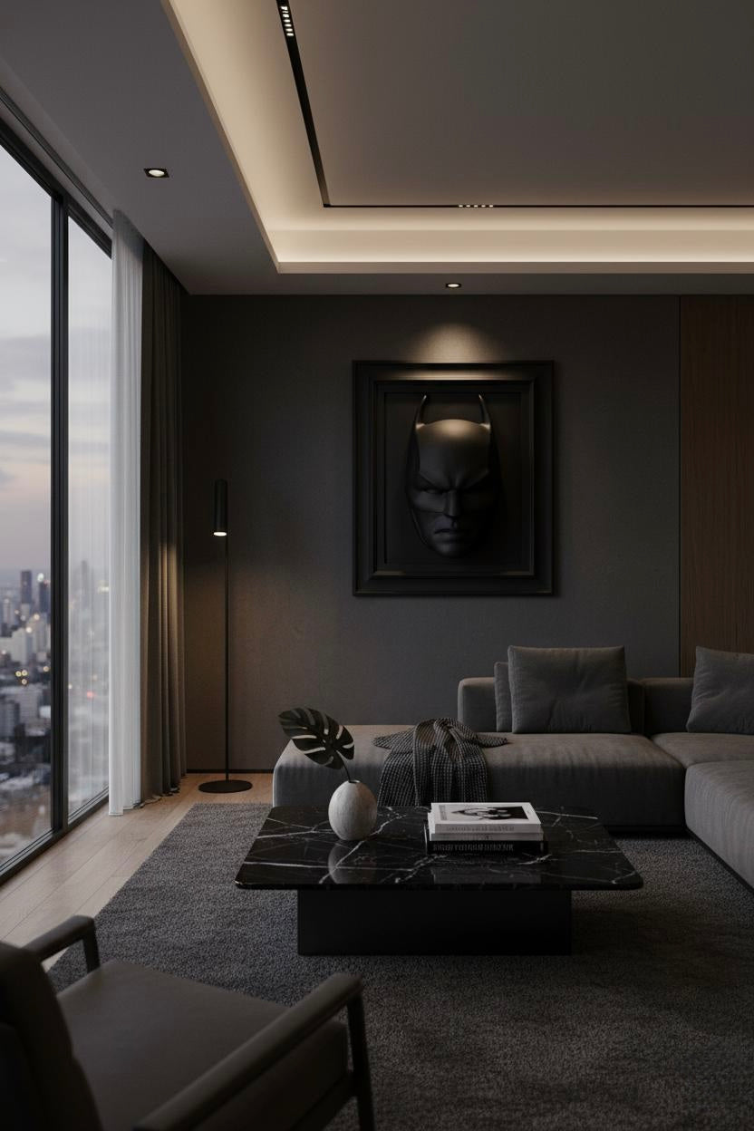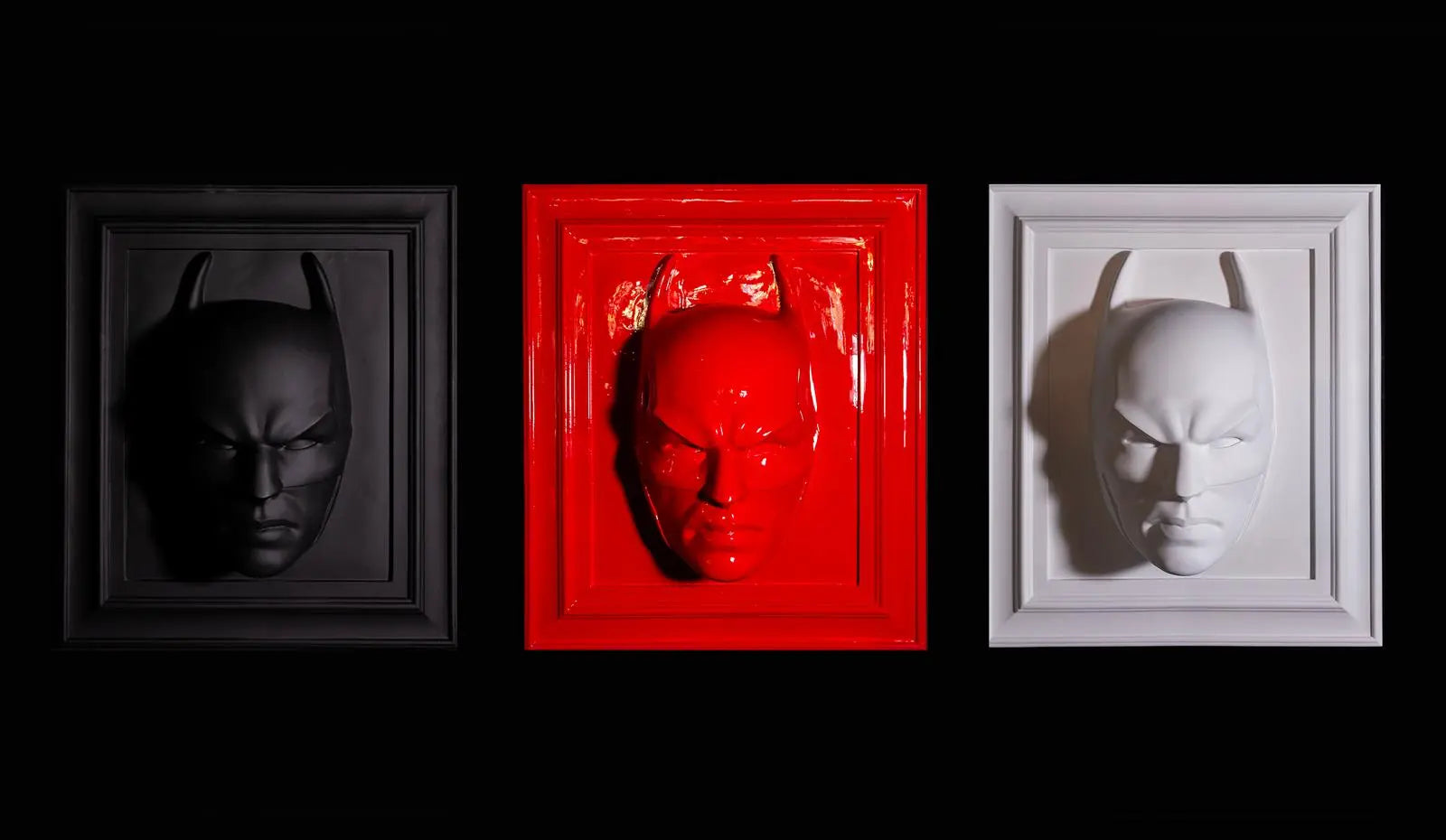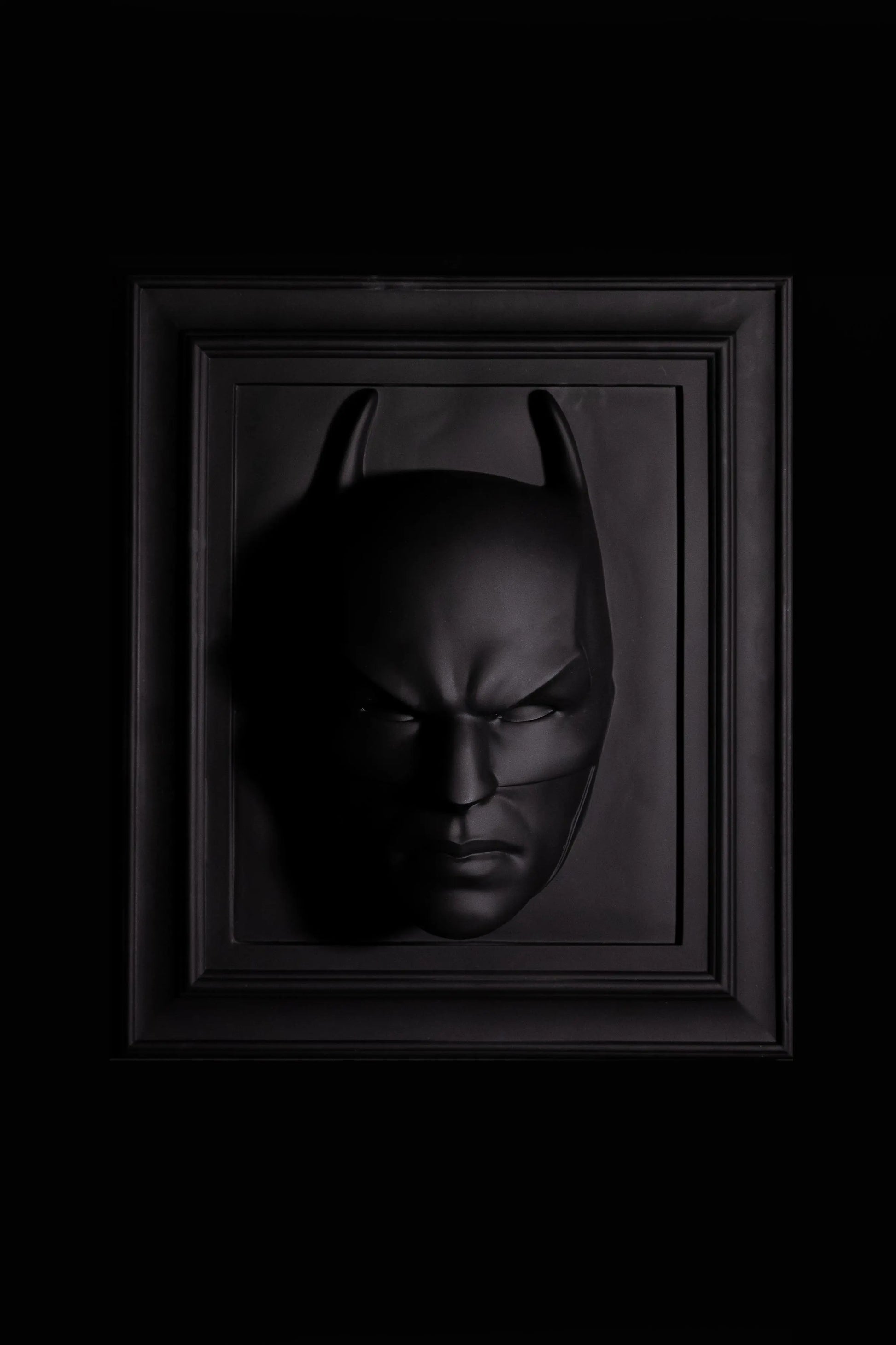 Un'opera scultorea elegante e di forte impatto, realizzata interamente in resina. La scultura riproduce l'iconica maschera di Batman in una finitura nero opaco, elevando il popolare simbolo della cultura pop a oggetto d'arte minimalista e contemporaneo.