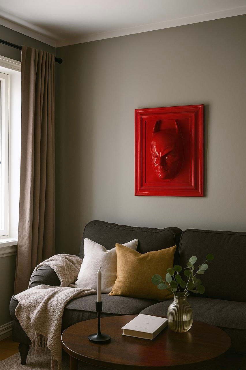 Un'opera scultorea elegante e di forte impatto, realizzata interamente in resina. La scultura riproduce l'iconica maschera di Batman in una finitura rosso lucido, elevando il popolare simbolo della cultura pop a oggetto d'arte minimalista e contemporaneo.