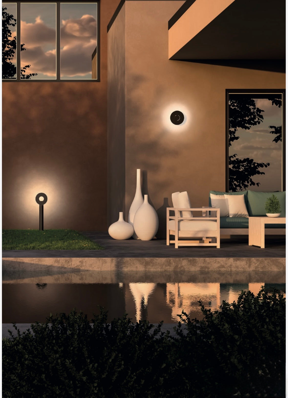 L'applique da esterno Free è un vero e proprio elemento di design, che unisce funzionalità e arte. La sua forma scultorea e minimalista è definita da un grande disco circolare in alluminio, con un'elegante finitura grigia.